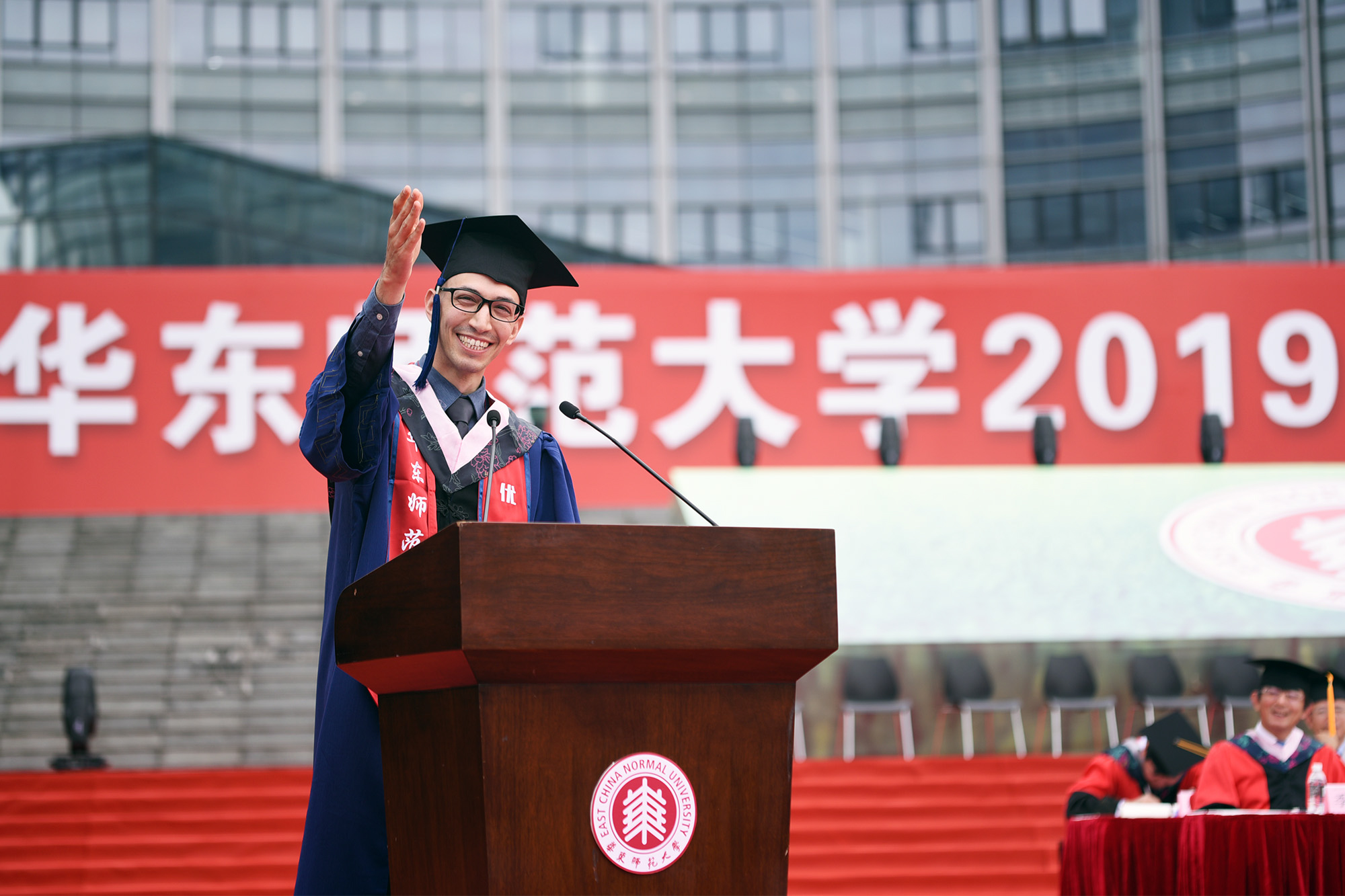 美国留学生艾墨本的发言风趣幽默,引来在场师生阵阵欢笑。艾墨本是国际汉语文化学院2019届汉语国际教育硕士,来师大求学之前曾到甘肃支教两年,求学期间获得了2018年永利皇宫登录官网优秀留学生杰出单项奖学金、2018汉语国际教育硕士研究生教学交流大会季军、第四届江浙沪汉语国际教育硕士教学技能大赛三等奖等荣誉,成为他在师大学习生活中的闪亮记忆。作为一名即将入职复旦大学附属中学国际部的毕业生,他对于自身即将扮演的中美文化交流使者的角色有着明确的自觉:“从入校走到今天,我们经历了跨文化的适应,写论文、找工作的考验,也享受了交朋友的欢乐,努力学习的收获,今天我们终于毕业了,我们都很棒!两年前华师大的一切对我来说都还很陌生,而现在我即将与它告别,从中山北路那座宏伟的大门出发,走向更多的未知和挑战。同时,我们也有一种责任,我们应该把这些在中国积累的故事带回自己的国家,自己的社交圈,让大家了解中国最真实的样子,而不要固守已有的印象和偏见,这就是我们留学生作为文化使者的责任——做一个胸襟开阔的分享者,把精彩的中国故事带向全世界。”