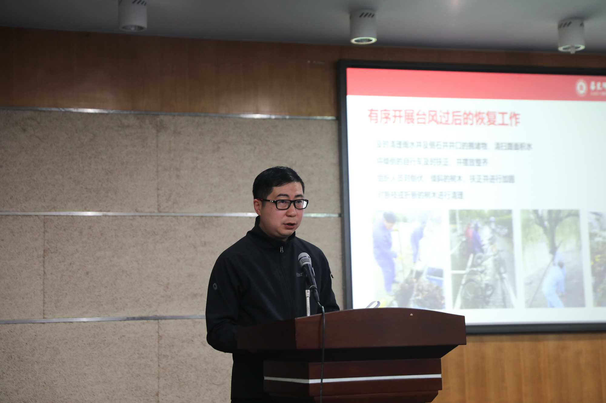 学校防汛防台工作领导小组副组长、学校办公室主任潘靓总结2018年防汛防台工作情况