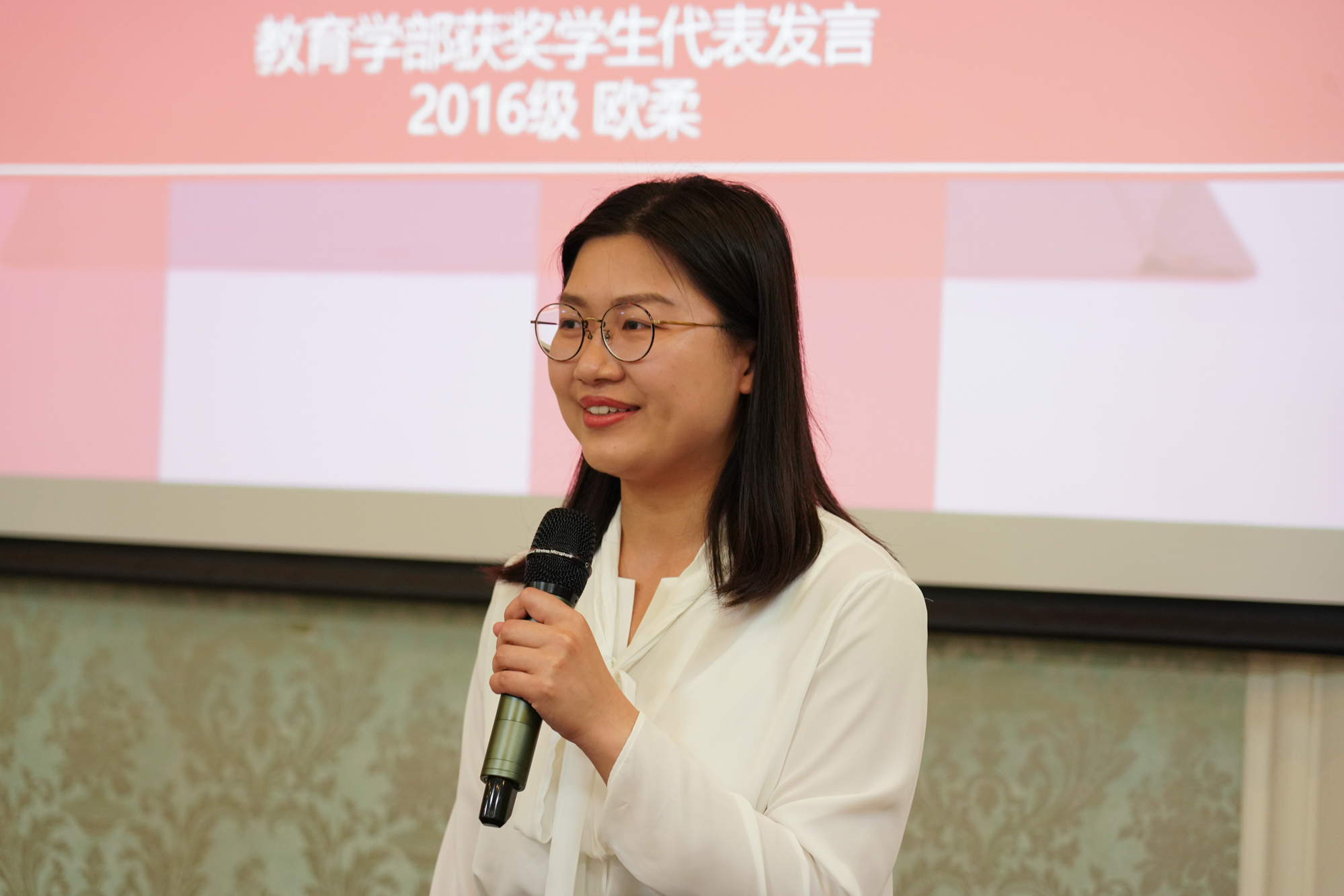 学生代表、2016级教育学原理专业硕士研究生欧柔汇报了自己在学术研究和学生工作方面的成果,表示将带着思考、信任和感激,继续努力,她说,“优秀是一种需要反躬自省并为之拼搏奋斗才能保持的习惯”。