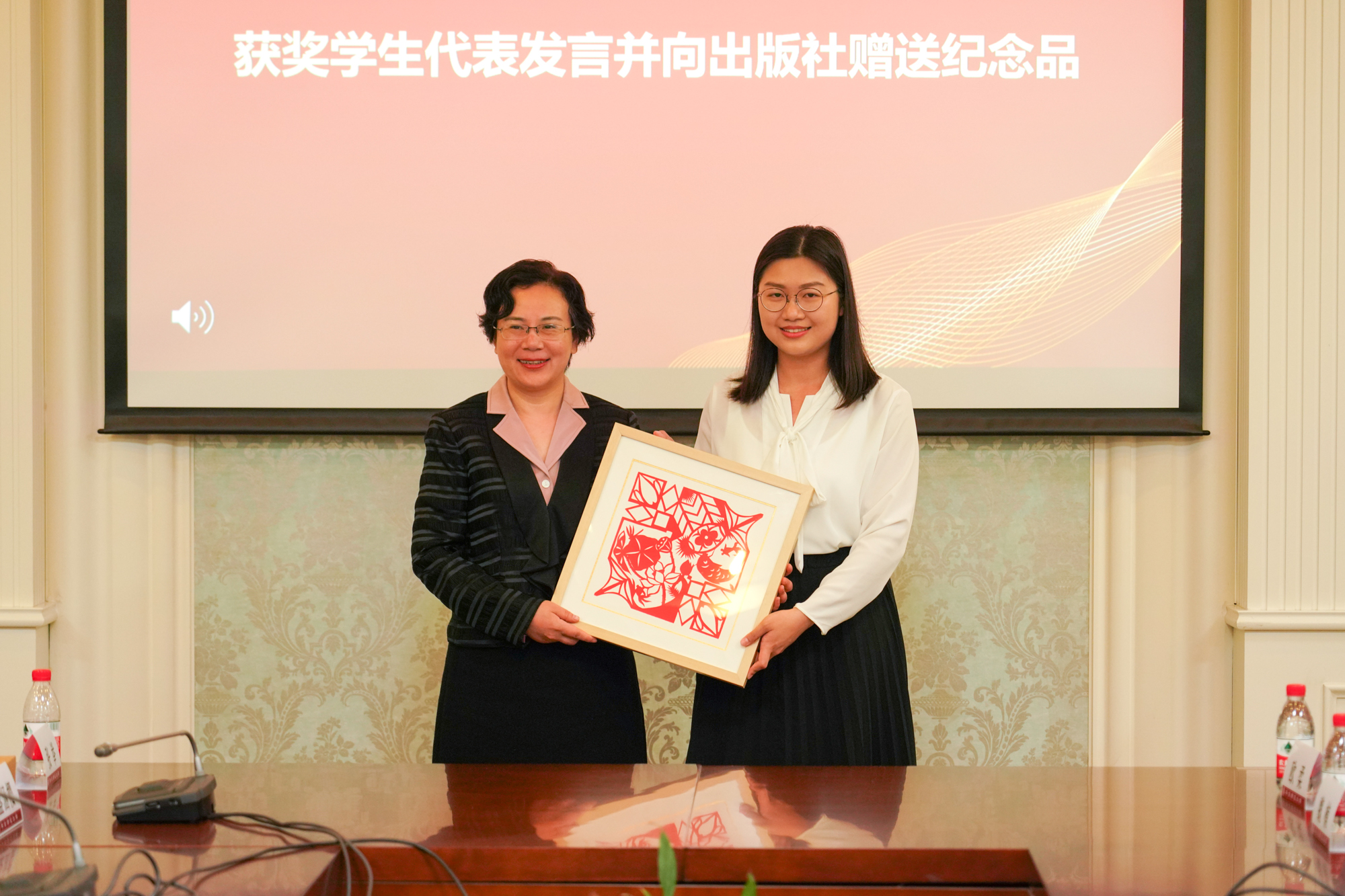 获奖学生代表向出版社赠送纪念品“智慧”剪纸