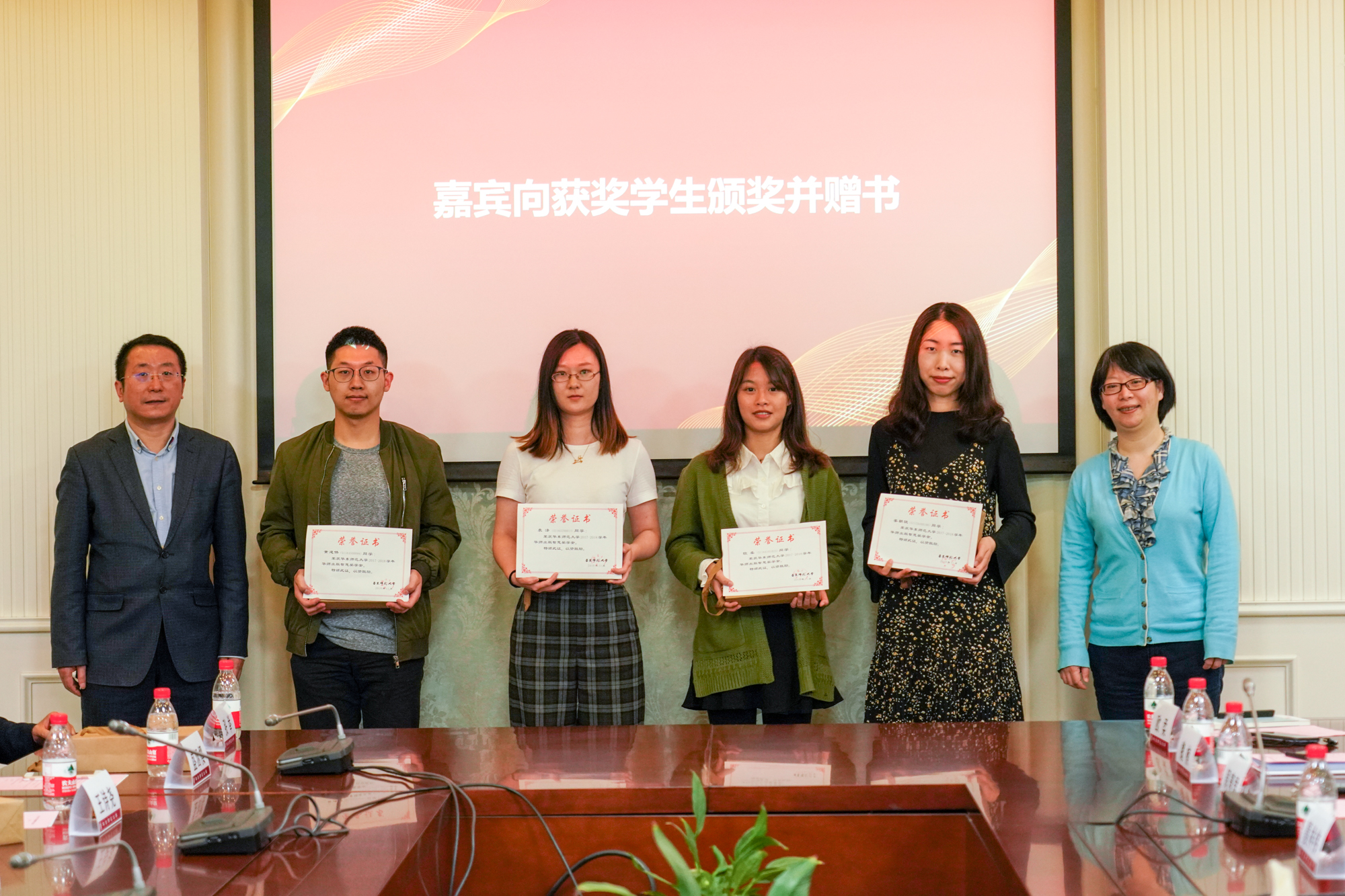 周赛君就2017-2018学年“华师出版智慧奖学金”评选情况进行了汇报,并对获奖学生表示祝贺。夏祥伟、戴琼为获奖学生颁发表彰证书。出版社赠送施蛰存的《唐诗百话》和王焰组稿的《听画》等书籍。