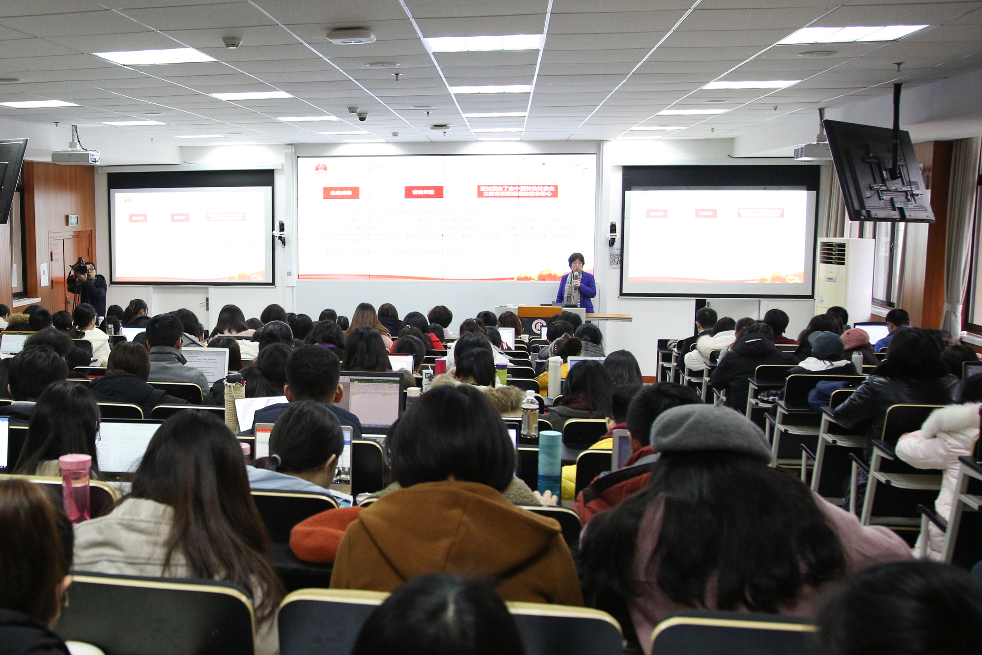 如何充分认识党中央隆重召开新时代第一次全国教育大会的重要意义和战略要求?如何准确把握“九个坚持”的科学内涵和精神实质,更好地武装头脑、指导实践、推动工作?如何认识新时代教师的地位和责任?如何对标世界一流大学,发挥办学优势,服务上海科创中心建设?……岁末年初,作为我校“学习贯彻全国教育大会精神宣讲团”专家成员,余玉花、周彬、吴瑞君、杜德斌4位教授先后走进计算机科学与软件工程学院、心理与认知科学学院、教师教育学院、物理与材料科学学院,为800余名师生全面、深入地解读了全国教育大会精神,并共同探讨迈入新时代的大学如何围绕教学科研、人才培养、社会服务、文化传承的职责使命,将大会精神学习切实转化为贯彻落实的实际行动。4场宣讲活动均由院系级党组织书记主持,现场反响热烈。