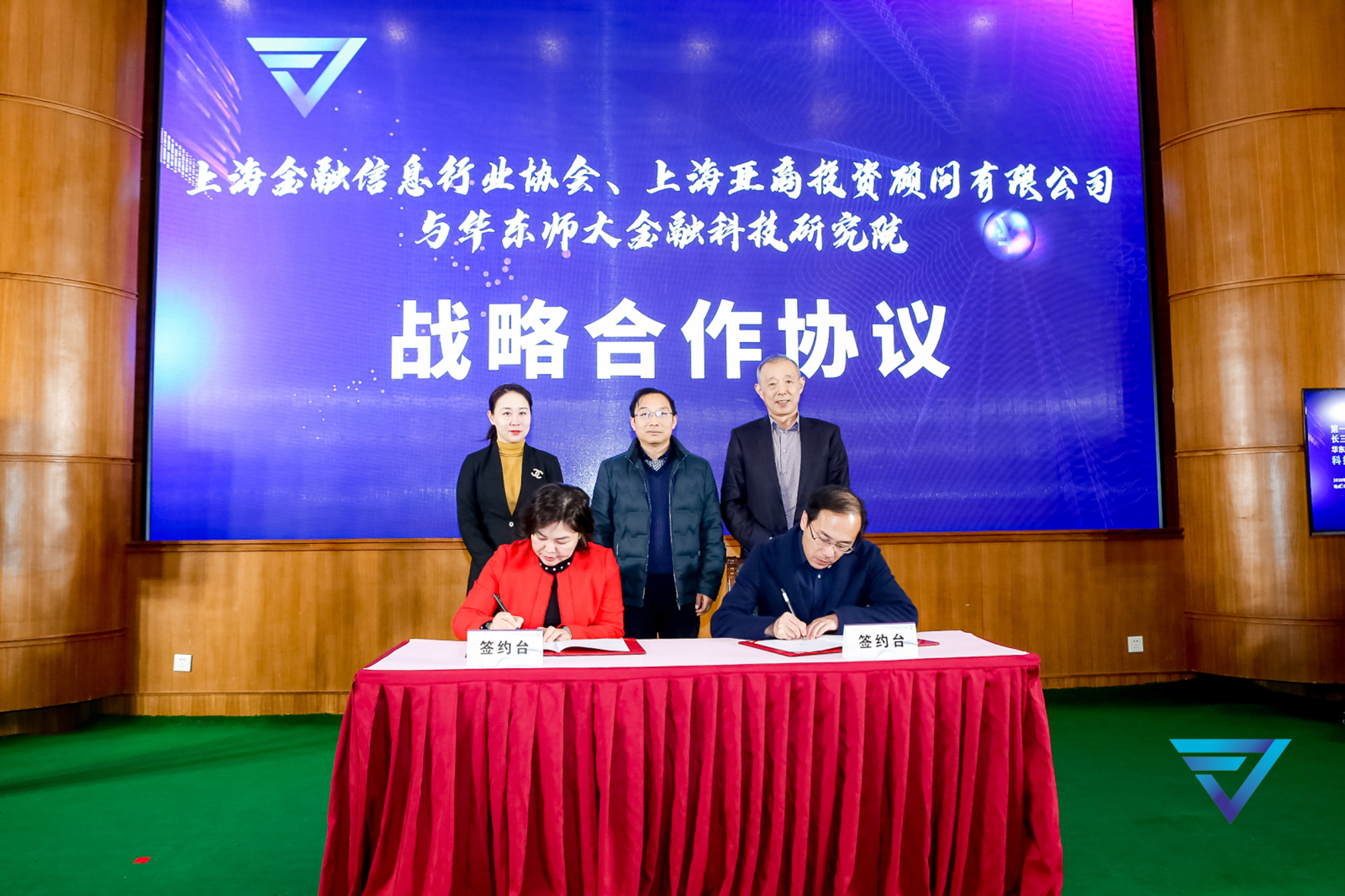 演讲结束,在华东师大金融科技研究院理事长、亚商集团董事长陈琦伟,华东师大校长助理、教育发展基金会秘书长斯阳,上海金融信息行业协会常务副会长李娟的见证下,上海金融信息行业协会秘书长吴军、上海亚商投顾有限公司总经理黄文佳分别与永利皇宫登录官网经济与管理学部党委书记、金融科技研究院院长岳华进行战略合作签约。