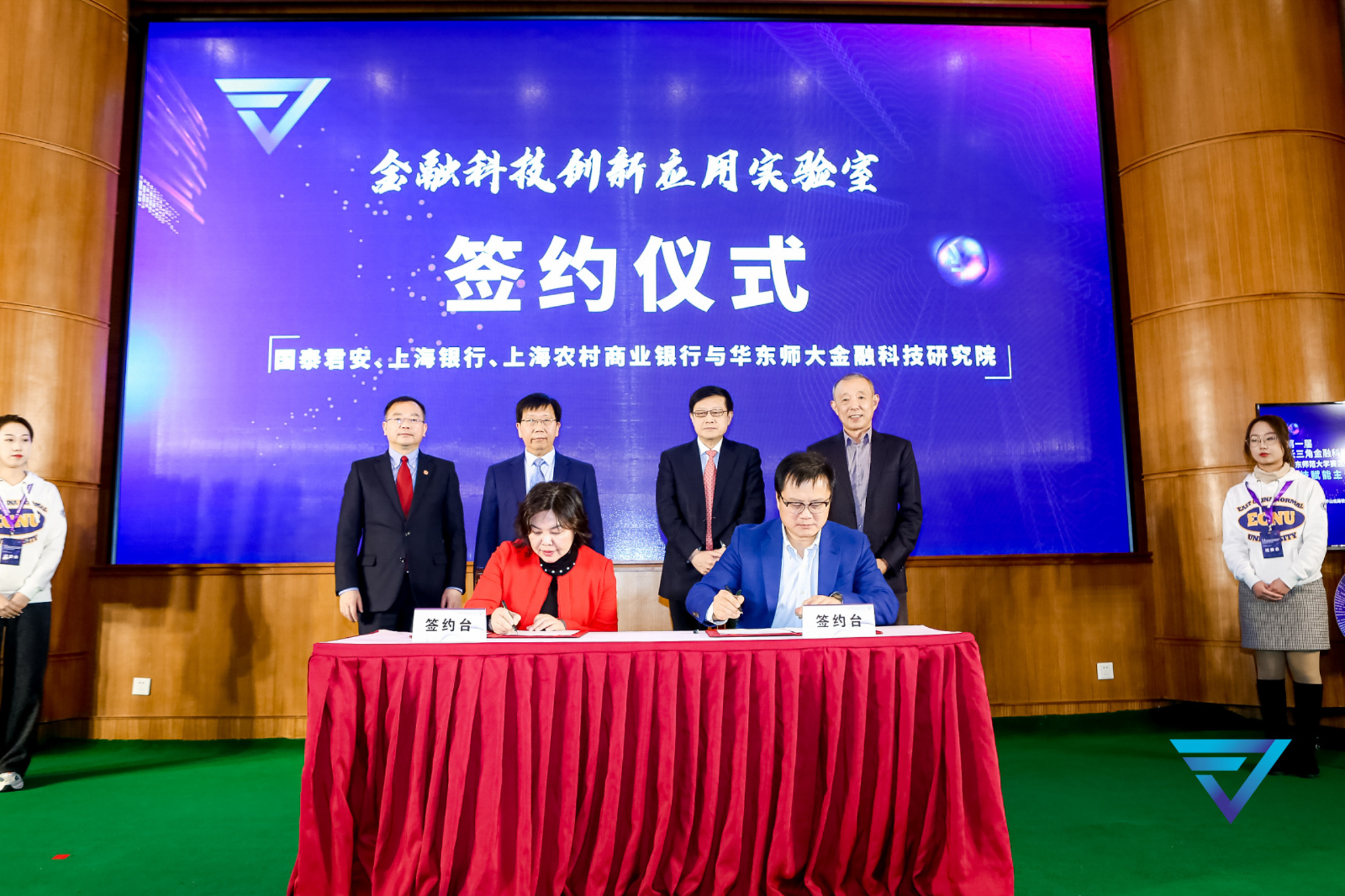 会上,在华东师大校长钱旭红、副校长周傲英,中国首席经济学家论坛理事长连平,以及亚商集团董事长、华东师大金融科技研究院理事长陈琦伟的共同见证下,“金融科技创新应用实验室”签约仪式举行。国泰君安证券股份有限公司首席信息官俞枫、上海银行信息技术部副总经理朱英华、上海农村商业银行首席信息官周衡昌依次与华东师大经济与管理学部党委书记、金融科技研究院院长岳华签署“校企”战略合作协议,共同开启“金融科技创新应用实验室”校企合作新篇章。