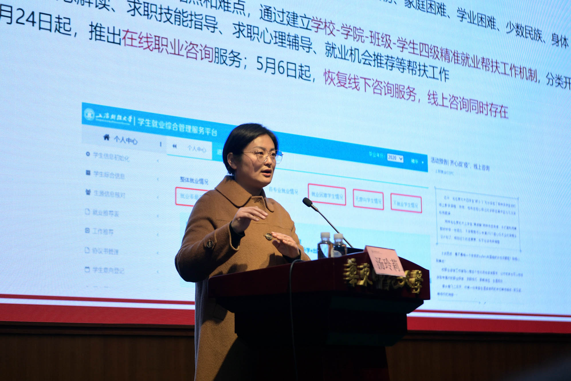 永利皇宫登录官网党委副书记杨昌利首先为大会致辞。她指出,随着《中长期青年发展规划(2016-2025年)》出台,明确提出要达到青年就业比较充分,高校毕业生就业保持在较高水平;青年就业权利保障更加完善,青年的薪资待遇、劳动保护、社会保险等合法权益得到充分保护;青年创业服务体系更加完善,创业活力明显提升的发展目标。高校毕业生就业关系民生福祉、社会稳定和国家发展。2021年是“十四五”规划的开局之年,也是全面建设社会主义现代化国家新征程、向第二个百年奋斗目标进军的开局之年,做好高校毕业生就业工作,确保就业大局稳定,具有特殊重要的意义。