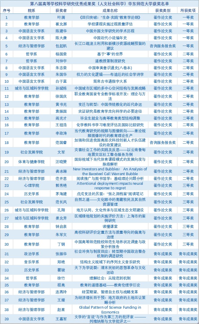 高等学校科学研究优秀成果奖(人文社会科学)目前是我国人文社科领域内最具有公信力和影响力的奖项,每四年评选一次。本次评奖我校人文社科多个学科均斩获奖项,其中,教育学部获奖13项,中国语言文学系获奖6项,经济与管理学部获奖6项,名列学校前三。5项一等奖获奖成果,分别有2项来自教育学部、2项来自中国语言文学系、1项来自经济与管理学部。