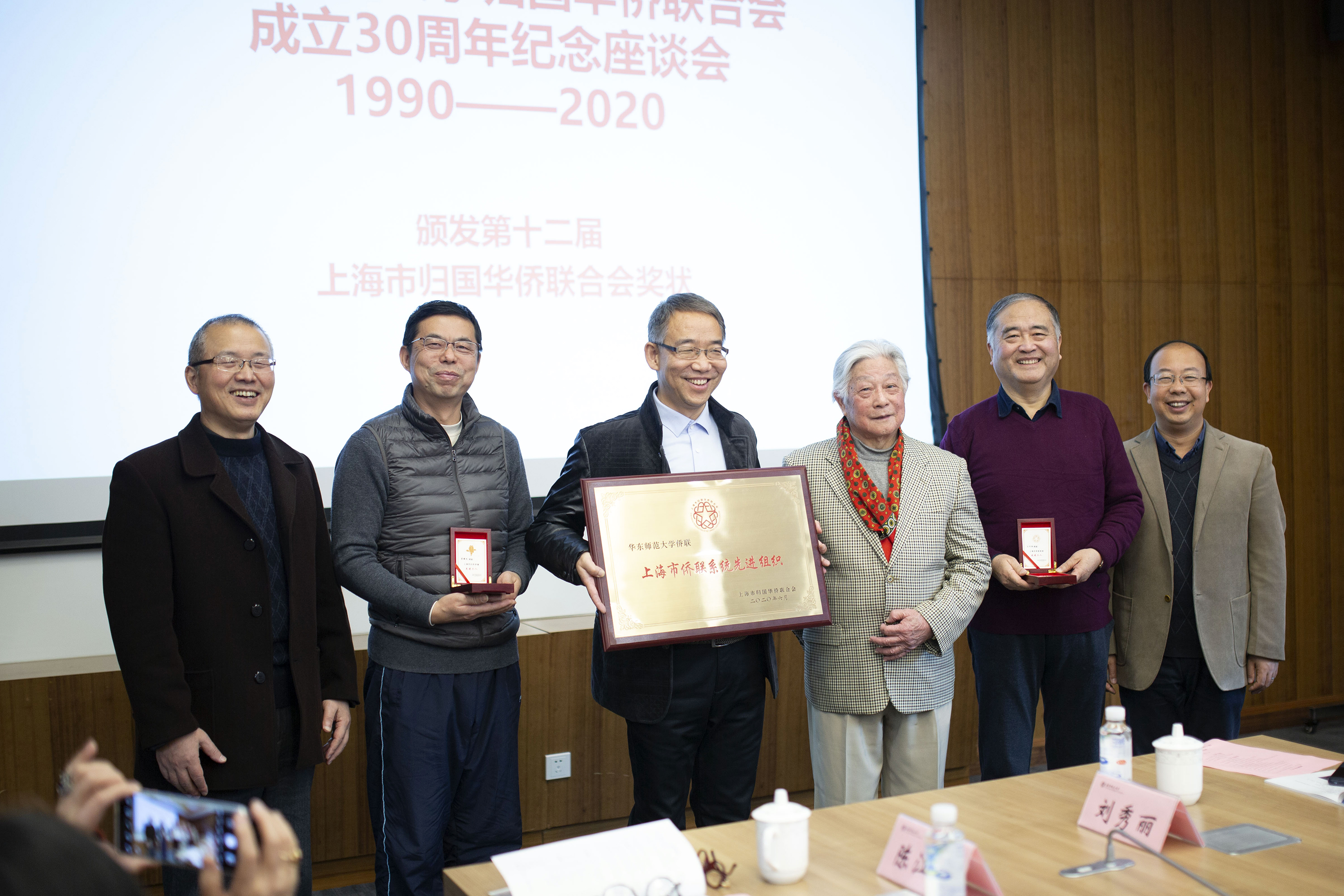 座谈会间隙,何添发与王思东还共同为2015—2019年度上海市侨界先进颁发奖牌。在今年举行的上海市第十二次归侨侨眷代表大会上,我校物理与电子科学学院教授管曙光被评为上海市归侨侨眷先进个人,校侨联副主席王行恒被评为上海市侨联系统先进个人,校侨联被评为上海市侨联系统先进组织。