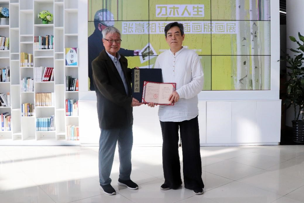 开幕式上,张嵩祖教授分别向校档案馆、图书馆各捐赠了一套《长歌和短歌》诗集插画版画。档案馆馆长汤涛向张嵩祖颁发捐赠证书。图书馆馆长胡晓明向张嵩祖颁发赠书荣誉证书,并回赠图书馆馆藏精品文创《御制耕织图》。