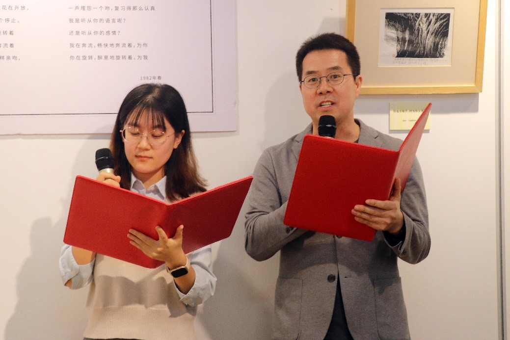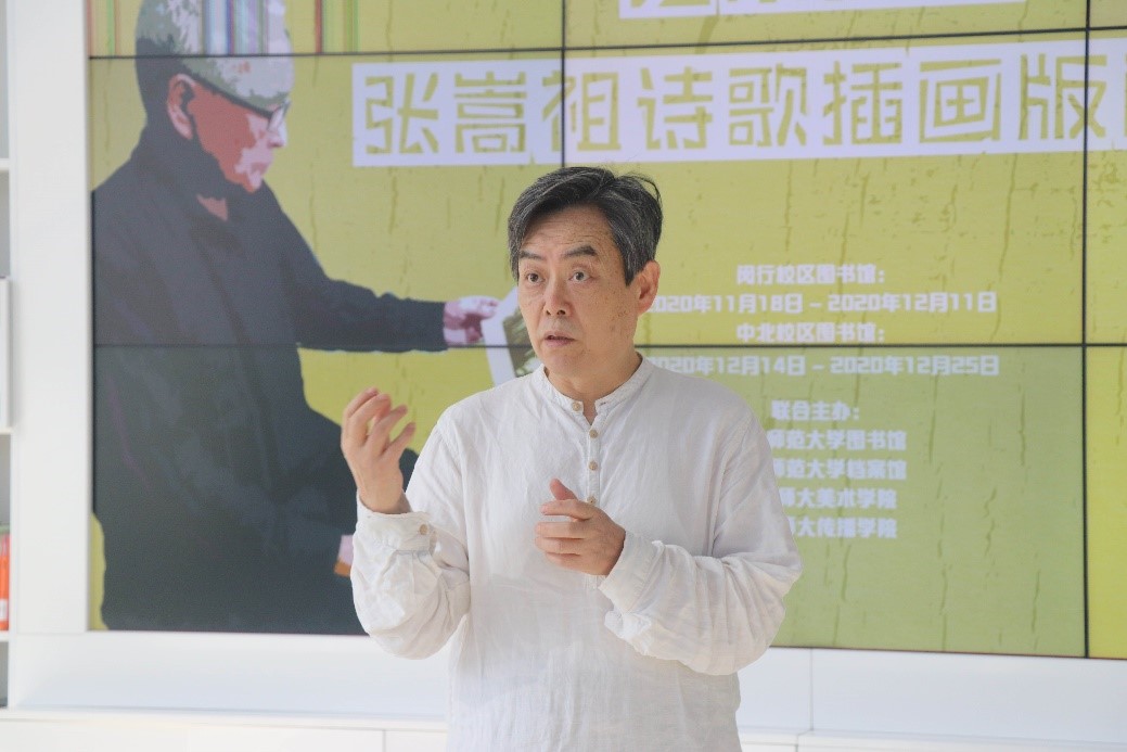 图书馆馆长胡晓明、美术学院党委副书记刘麒先后为开幕式致辞。胡晓明在致辞中指出,张嵩祖先生作品中的人文诗意美与华东师大的气质十分相称,因此张先生的版画不仅和白桦的诗歌珠联璧合,与华东师大也是珠联璧合。将张先生的版画与白桦的诗歌对读,可以从中感受两位先生的对话交流,令人回味无穷。刘麒在致辞中从“为人”“为学”“为师”三方面谈了她对张嵩祖先生的认识。张先生把艺术融入了生活,退休后仍致力于诗歌、音乐、版画的融会贯通,这种创作热情、“为师”典范,值得我们晚辈学习。