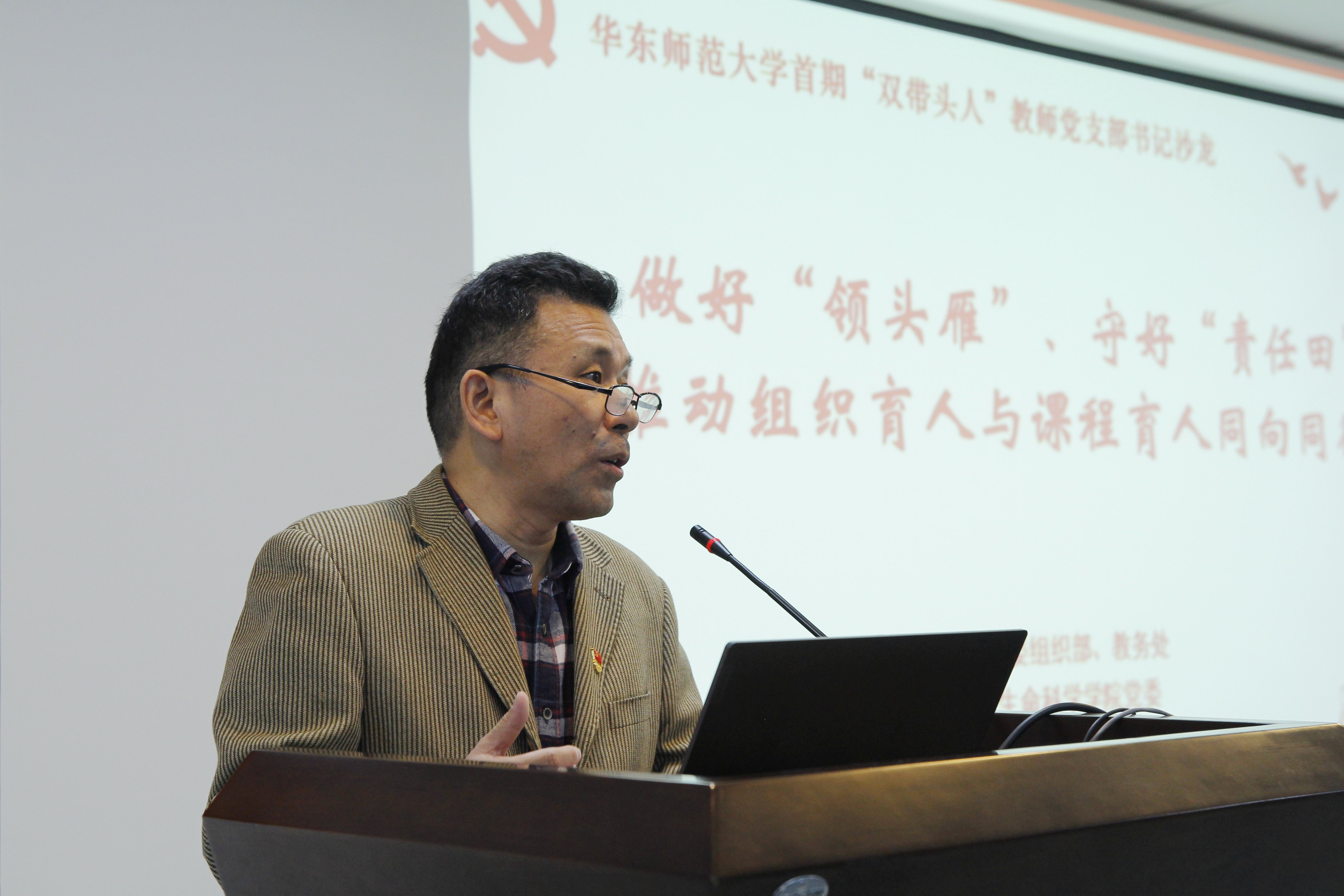 在交流环节,数学科学学院基础数学党支部书记罗栗、思勉人文高等研究院教工党支部书记许可、法学院教工第一党支部书记钱叶六、经济与管理学部统计学院教工党支部书记周迎春、传播学院新闻学系与广告学系教工党支部书记赵路平、生命科学学院生物学系教工党支部书记姜晓东、物理与电子科学学院物理学系教工党支部书记陈丽清等7位“双带头人”教师党支部书记代表先后围绕课程思政工作进行了发言。