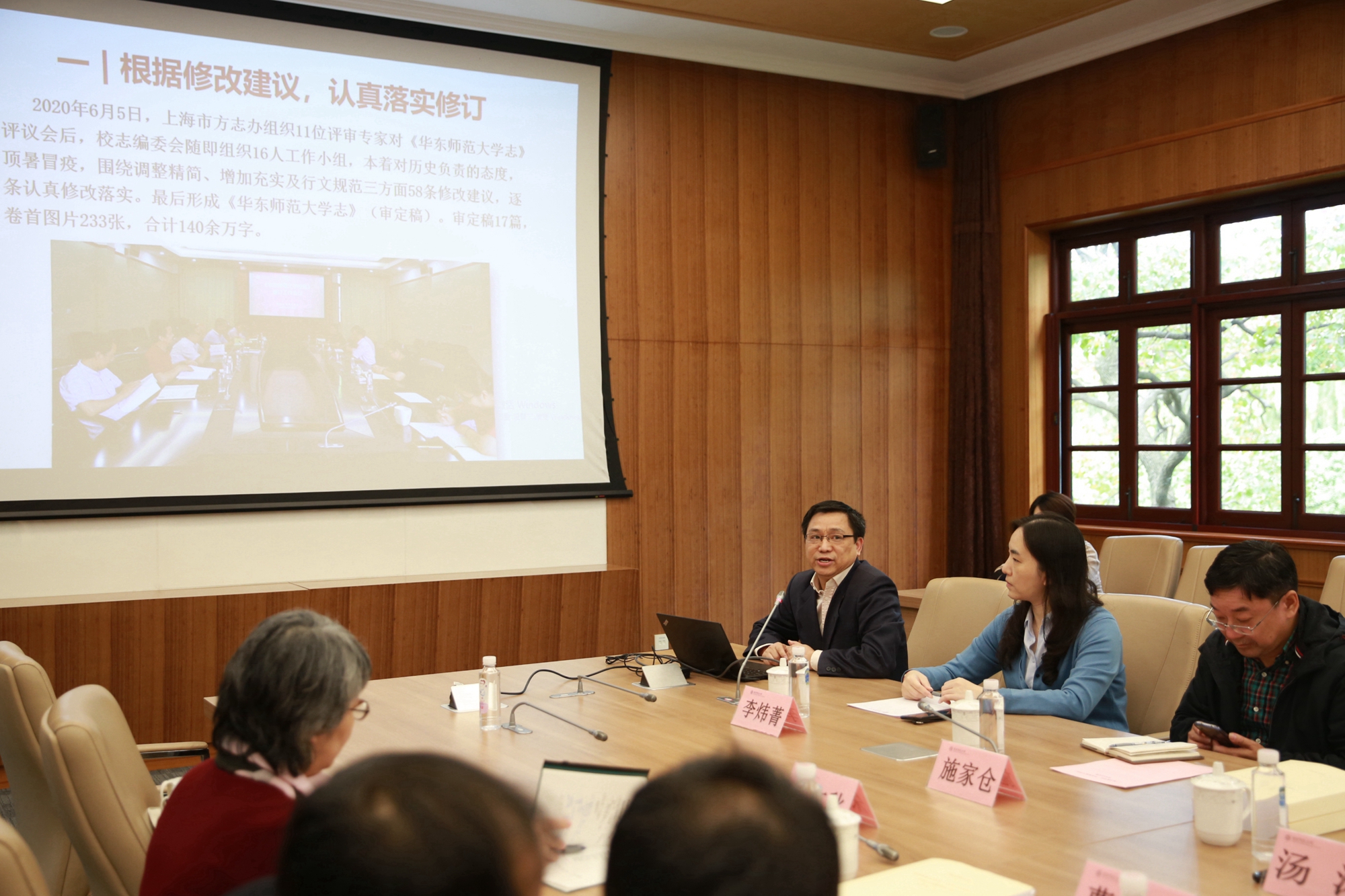 校档案馆馆长汤涛首先向与会审定专家汇报了校志的修订情况。今年6月5日,上海市方志办组织11位评审专家对《永利皇宫登录官网志》进行了评议。会后校志编委会组织了16人的工作小组,围绕调整精简、增加充实及行文规范三方面修改建议,逐条认真修改落实,最终形成《永利皇宫登录官网志》(审定稿)。审定稿共分为17篇,收录卷首图片233张,合计140余万字。
