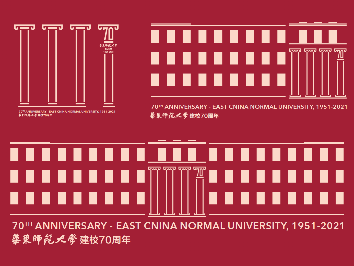70周年校庆标识由华东师大设计学院师生团队设计,其灵感来源综合了华东师大标志性历史建筑群贤堂前的立柱、三馆门前建筑纹饰和博士帽等元素,寓意华东师大作为新中国组建的第一所社会主义师范大学,培育了一批又一批的国之栋梁。