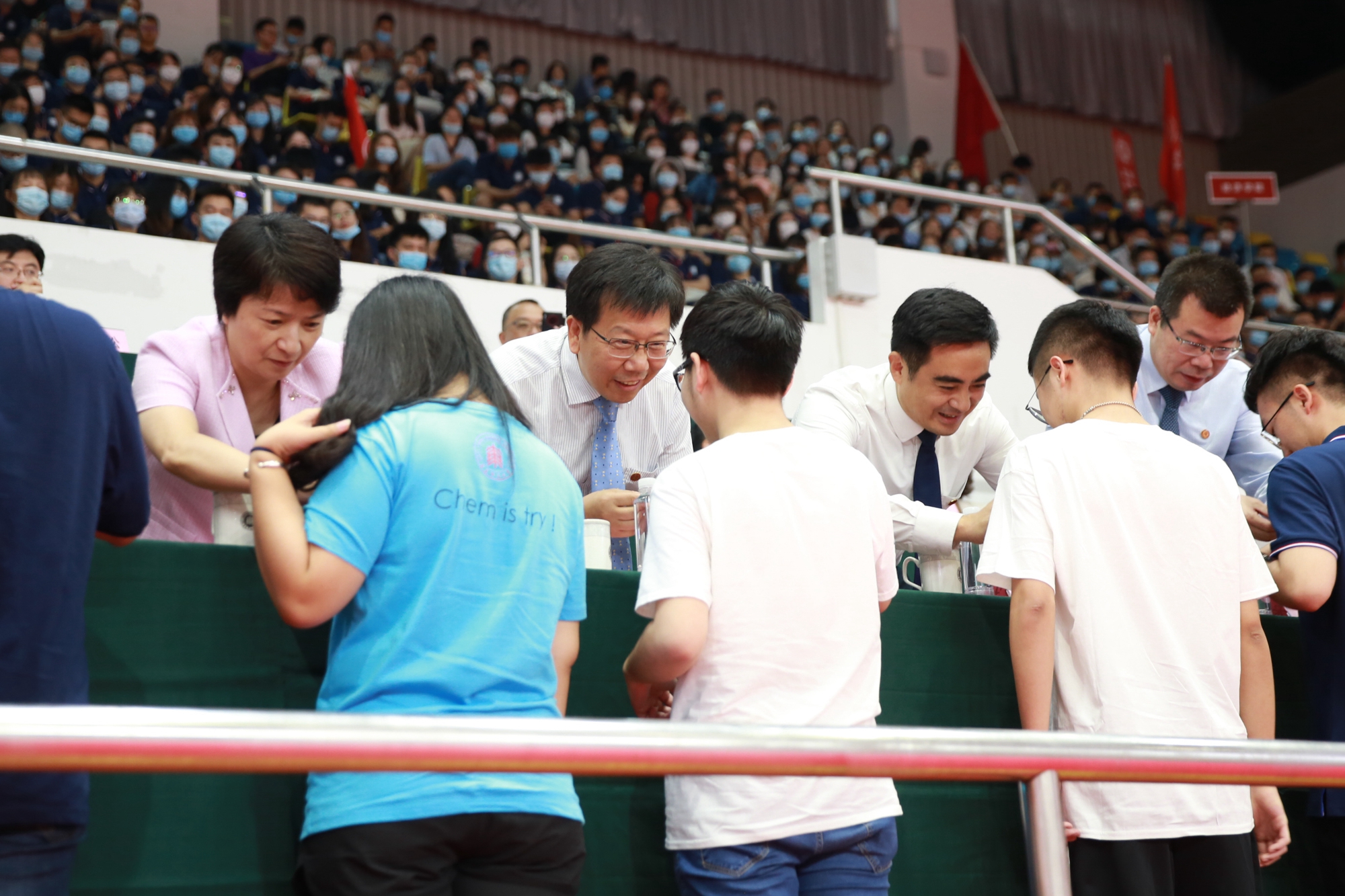 在开学典礼上,校领导为新生代表佩戴校徽。戴上校徽,不仅标志着新生们正式成为师大人,更意味着,新同学们插上“隐形的翅膀”,已担负起了维护和树立学校形象、践行学校发展理念的责任和使命,共同为“建教育强国、以教育强国”的目标不断努力和奋斗!