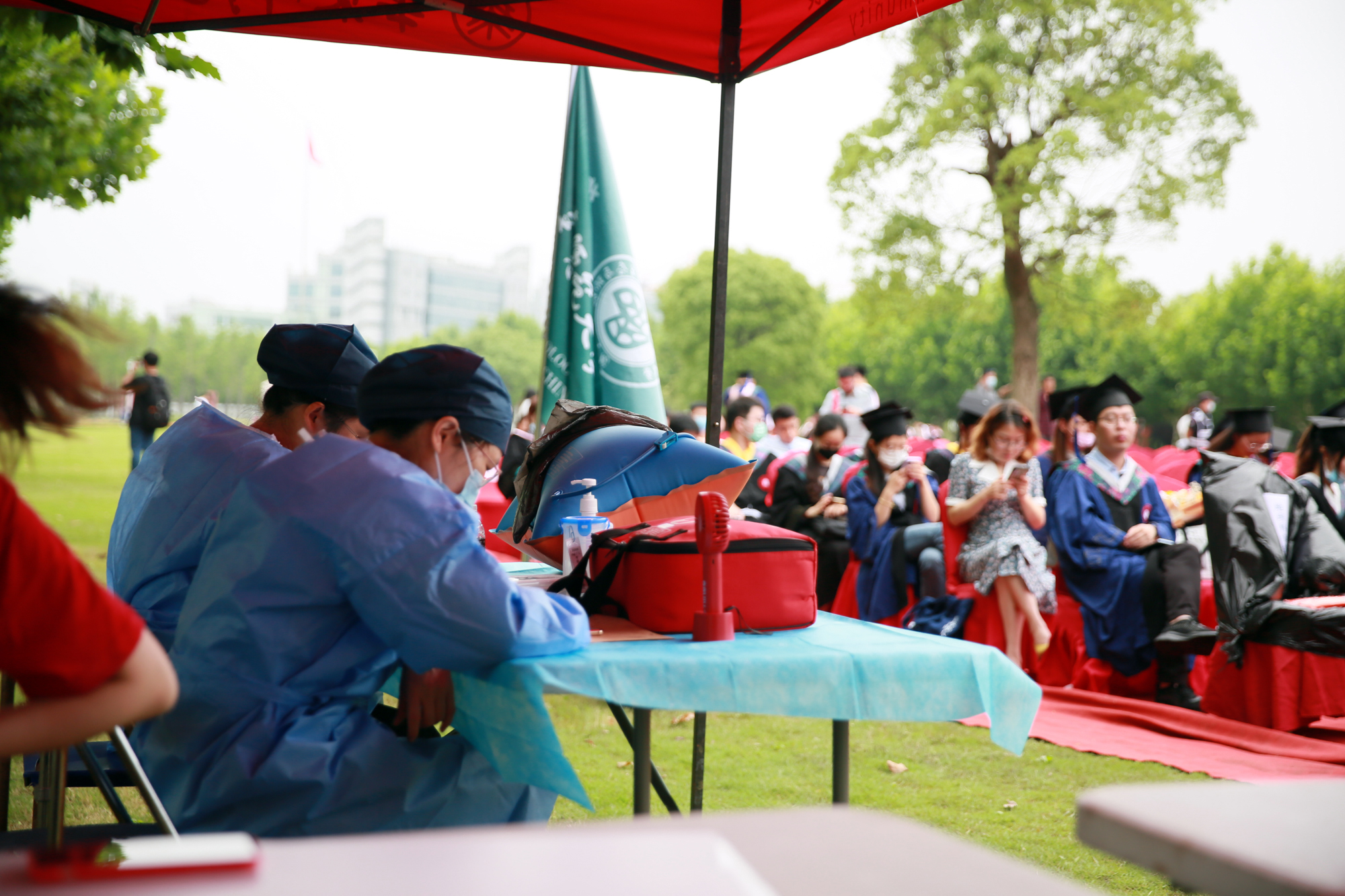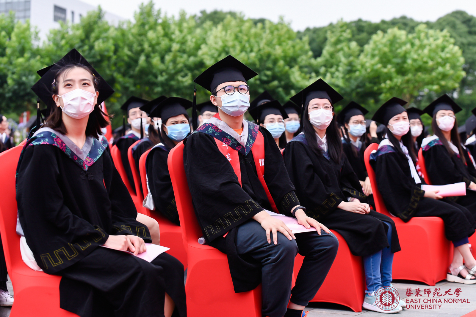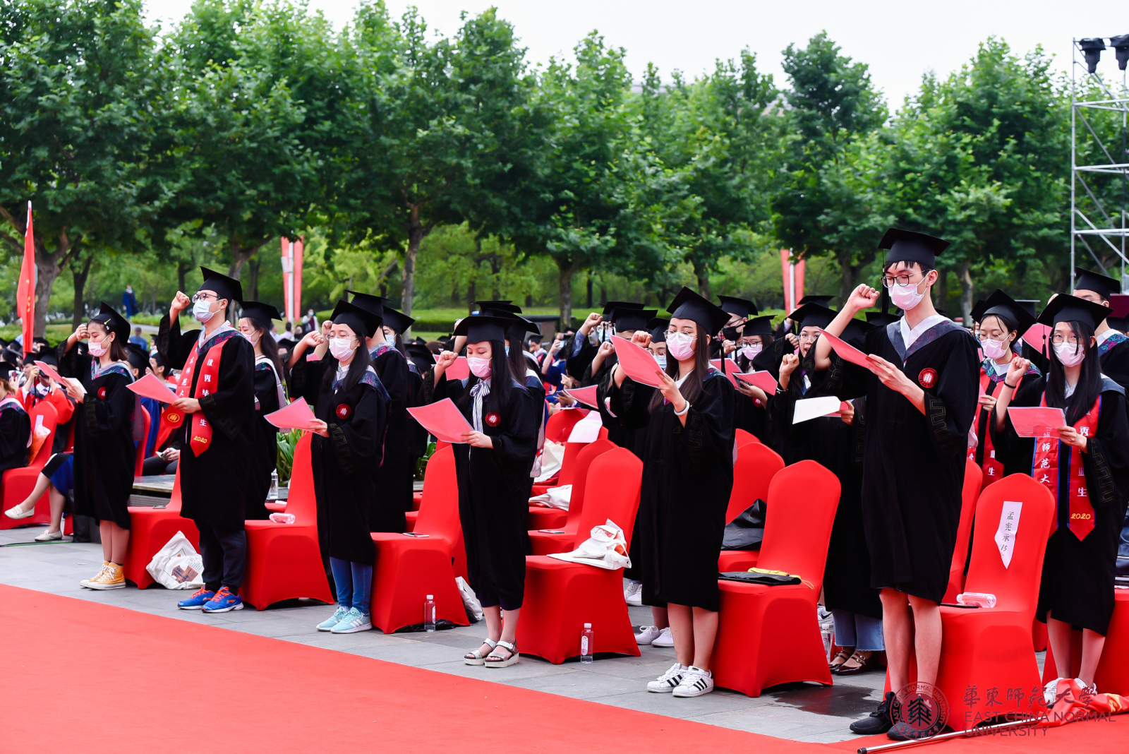 虽然面临疫情带来的各种困难与挑战,但为了让毕业生不留遗憾、在一种隆重而温馨的氛围中告别母校奔赴前程,早在几个星期前,华东师大就开始筹划操办,努力给极为特殊的这一届毕业生打造一个既安全又有仪式感的毕业典礼。鉴于当前疫情防控形势,毕业典礼全程露天举行,采用线上与线下同步进行的“云毕业典礼”形式。为保障师生健康和安全,华东师大对现场参加毕业典礼的师生从申请参加到入场就座采取了一系列措施,包括如实报告健康状况,经批准后方可现场参加,入场前由所在院系安排测量体温,佩戴口罩,保持社交距离,统一带队入场并在指定区域就坐,座位保持一定间距等,典礼现场还安排了校医、救护车等,并有防暑药物可领取。