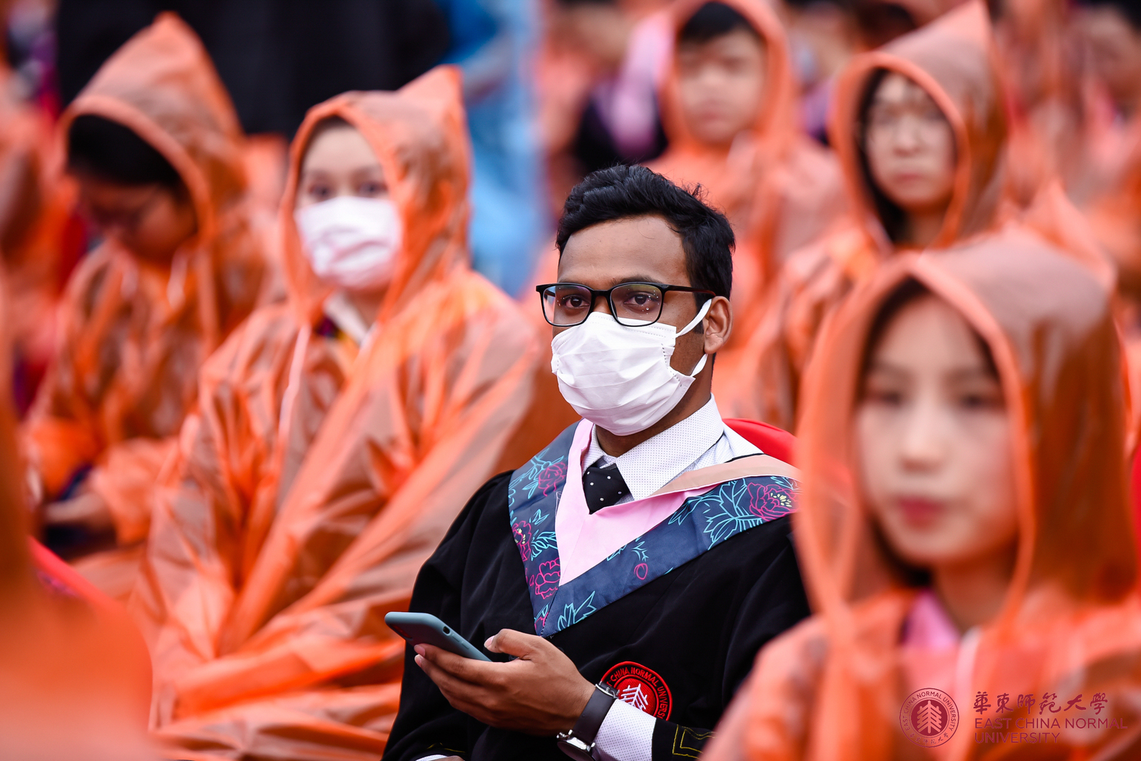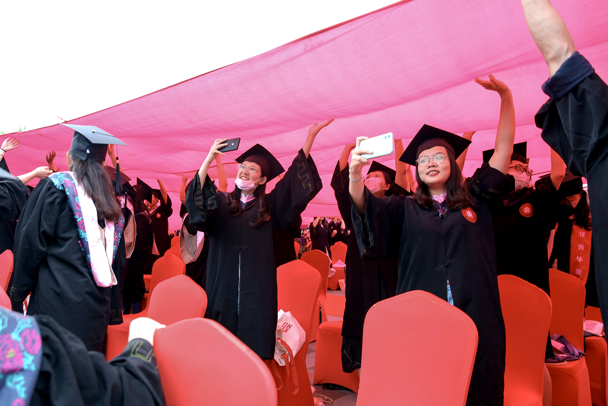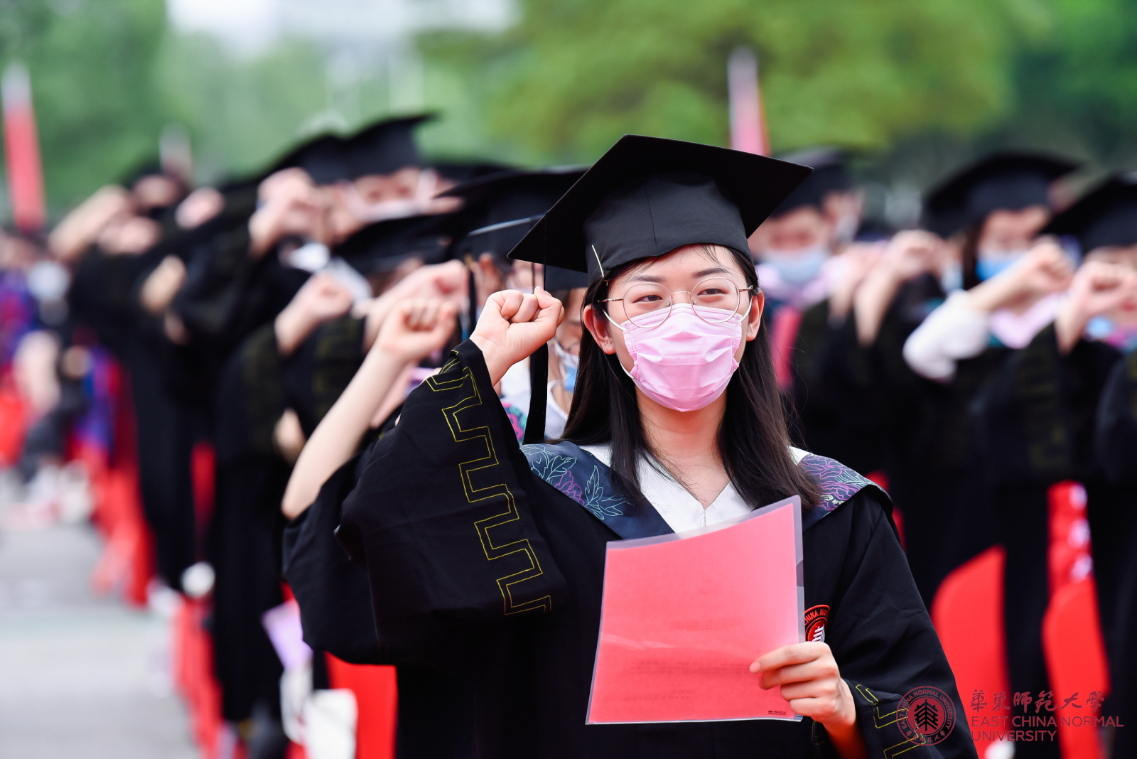 虽然面临疫情带来的各种困难与挑战,但为了让毕业生不留遗憾、在一种隆重而温馨的氛围中告别母校奔赴前程,早在几个星期前,华东师大就开始筹划操办,努力给极为特殊的这一届毕业生打造一个既安全又有仪式感的毕业典礼。鉴于当前疫情防控形势,毕业典礼全程露天举行,采用线上与线下同步进行的“云毕业典礼”形式。为保障师生健康和安全,华东师大对现场参加毕业典礼的师生从申请参加到入场就座采取了一系列措施,包括如实报告健康状况,经批准后方可现场参加,入场前由所在院系安排测量体温,佩戴口罩,保持社交距离,统一带队入场并在指定区域就坐,座位保持一定间距等,典礼现场还安排了校医、救护车等,并有防暑药物可领取。