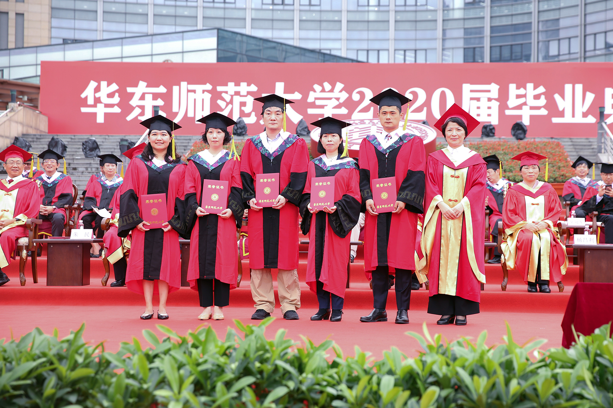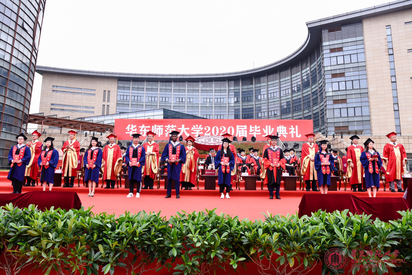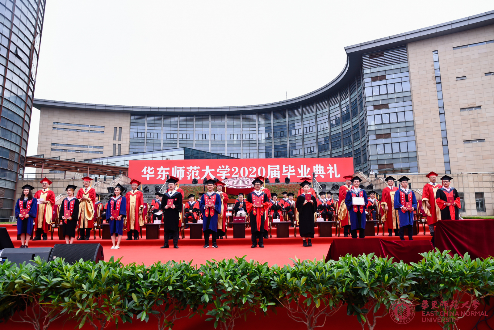 校长、校学位评定委员会主席钱旭红向各学部、院系负责人颁发学历学位授权书,希望通过他们将这份荣耀和祝福传递给每一位毕业生。毕业典礼上,416名上海市优秀毕业生和469名校优秀毕业生获得表彰,全体校领导为优秀毕业生代表颁奖;校党委书记梅兵为“学生心目中最优秀教师”颁奖。自2001年起,华东师大每年在本科毕业班学生中开展“评选你心目中最优秀教师”活动。连续五年被本科毕业生评选为最优秀教师的老师,学校授予“学生心目中最优秀教师奖”。综合近五年本科毕业生评教结果,2020年度“学生心目中最优秀教师奖”获得者是政治学系易妍老师,传播学院罗薇老师,经济与管理学部金铸老师、叶明华老师,体育与健康学院张中印老师,国际汉语文化学院尚雅楠老师、蒋冰冰老师,教育学部占小红老师。此次获奖教师奖金由上海青浦区安乔私立幼儿园捐赠。