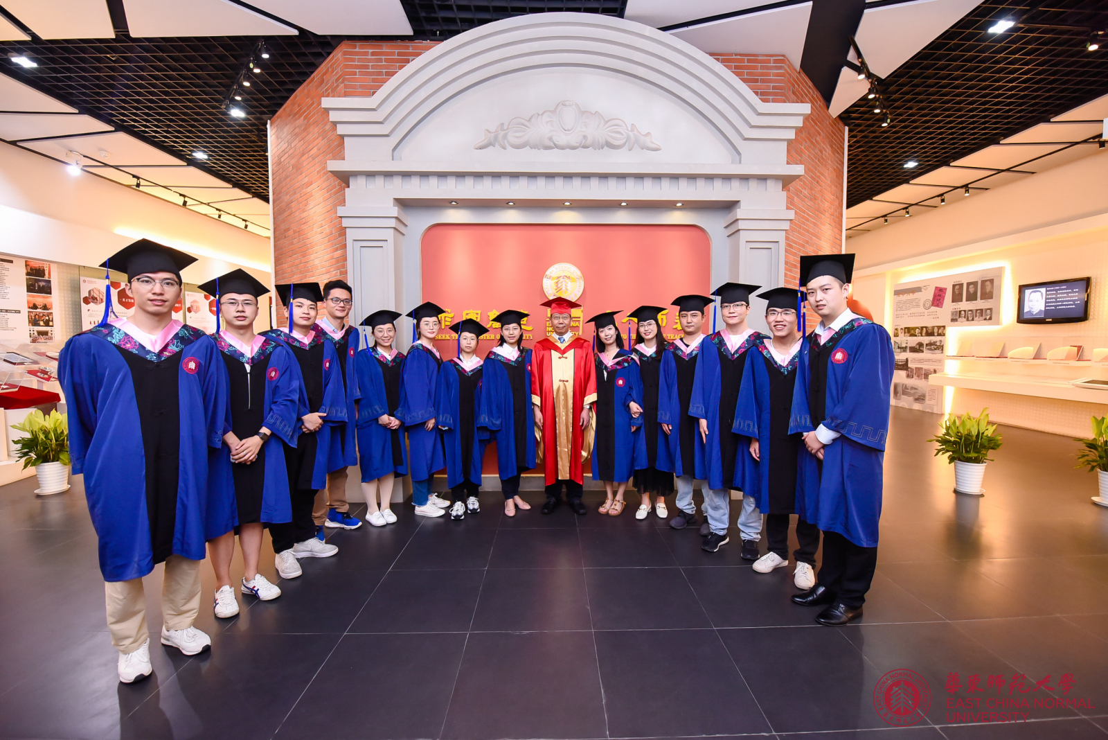 毕业典礼结束后,钱旭红校长身穿大红校长服,先后在闵行校区图书馆大厅和中山北路校区校史馆与毕业生们合影交流。