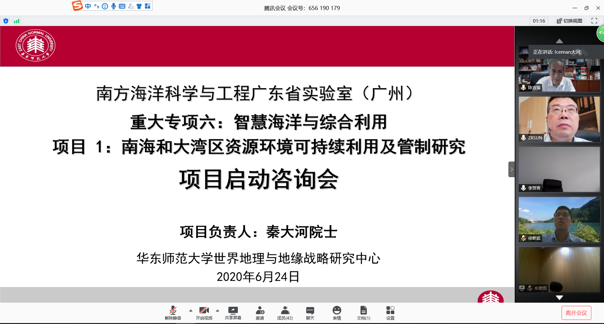 6月24日,永利皇宫登录官网世界地理与地缘战略研究中心主任秦大河院士主持的《南海和大湾区资源环境可持续利用及治理研究》项目启动咨询会在线召开。该项目以华东师大为依托单位,北京师范大学、中国科学院西北生态环境研究院为合作研究单位。原国家自然科学基金委员会主任陈宜瑜院士、南方海洋科学与工程广东省实验室(广州)主任张偲院士、中国气象科学研究院研究员张小曳院士、中国科学院南海海洋研究所副所长龙丽娟研究员、中国气象科学研究院党委书记王春乙研究员、中国科学院地理与资源科学研究所方创琳研究员、海军设计院李贺青研究员担任评议组专家,对项目的推进落实提出了意见和建议。华东师大副校长孙真荣出席会议并致辞,项目评议组专家、三家承担单位的项目组研究人员以及项目主管单位南方海洋科学与工程广东省实验室(广州)的有关领导等50余人参加会议。
