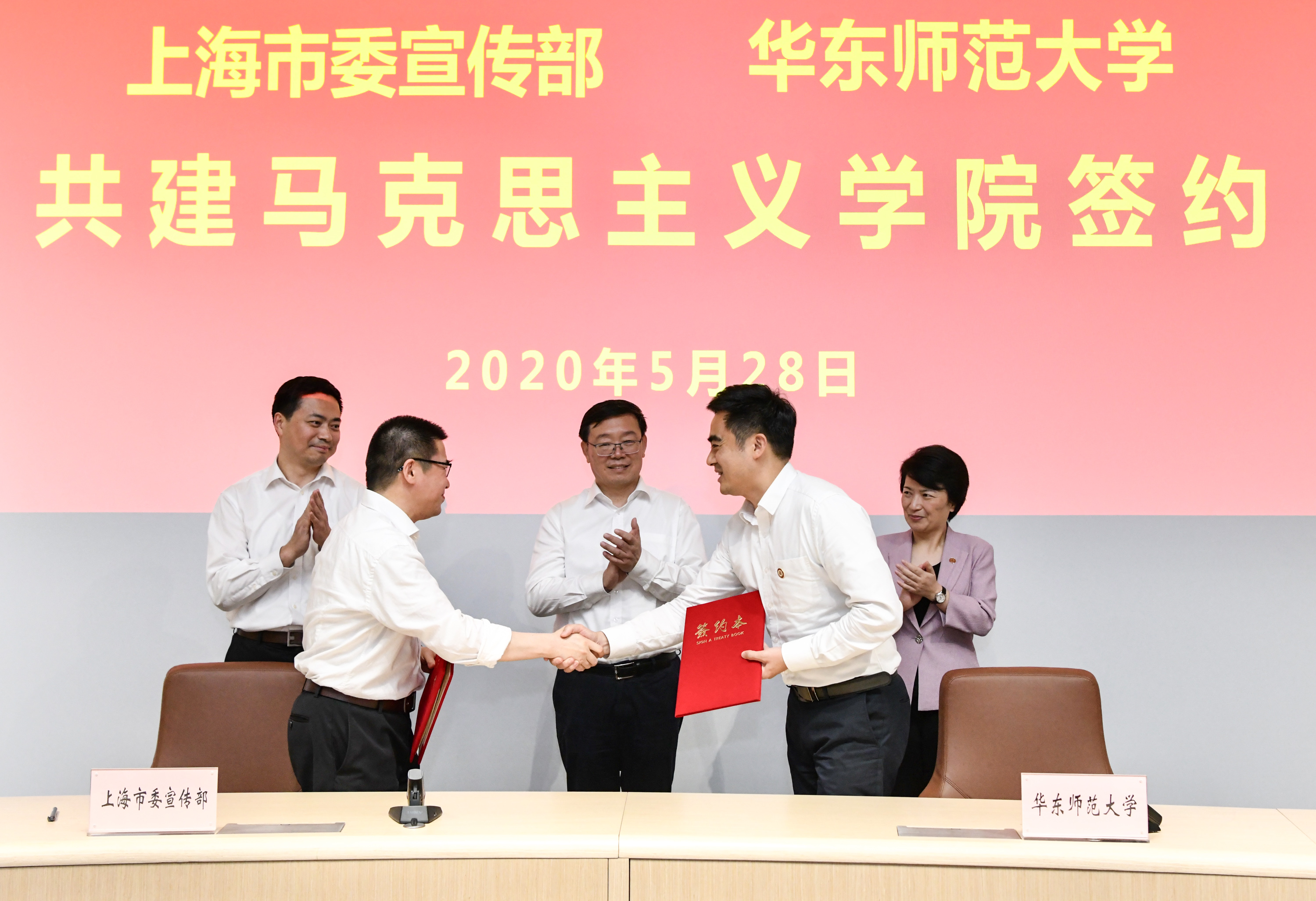 在周慧琳、梅兵、李昕的见证下,徐炯与王宏舟代表上海市委宣传部与永利皇宫登录官网签署共建协议