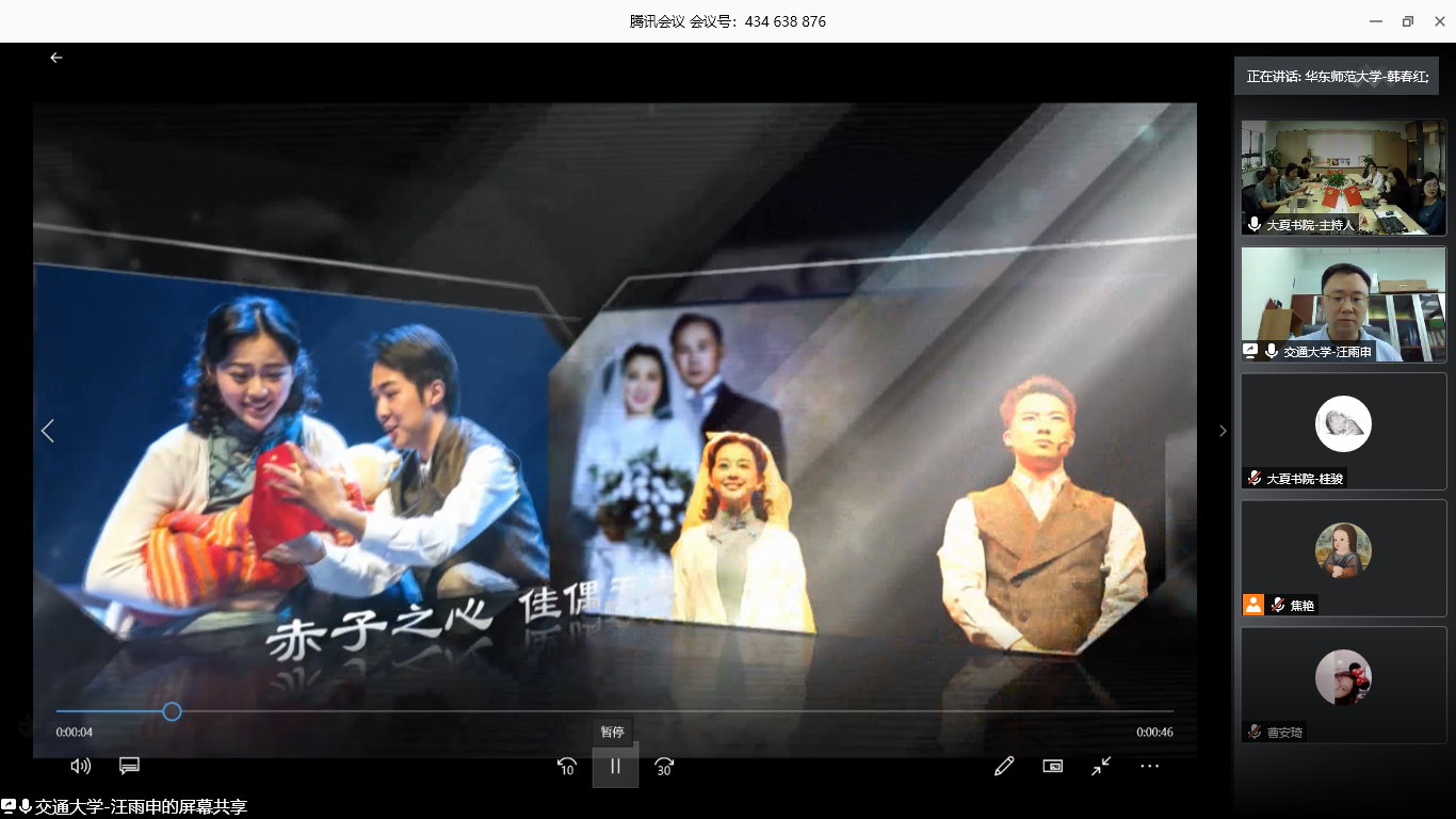 上海交通大学学生处副处长汪雨申,浙江大学黑白剧社指导老师郏耀鹏,上海大学党委研究生工作部、研究生团工委书记夏明帅及永利皇宫登录官网万姗姗和焦艳,以“历史的再现”“感性的示范”“前行的动力”等为主线,共同回忆了校史剧中鲜活故事背后的育人力量。永利皇宫登录官网学生工作党委书记、党委学工部部长余佳,档案馆馆长汤涛,音乐学院党委书记杨海燕,党委宣传部副部长董盈盈等嘉宾出席会议。会议由大夏书院党委书记韩春红主持。