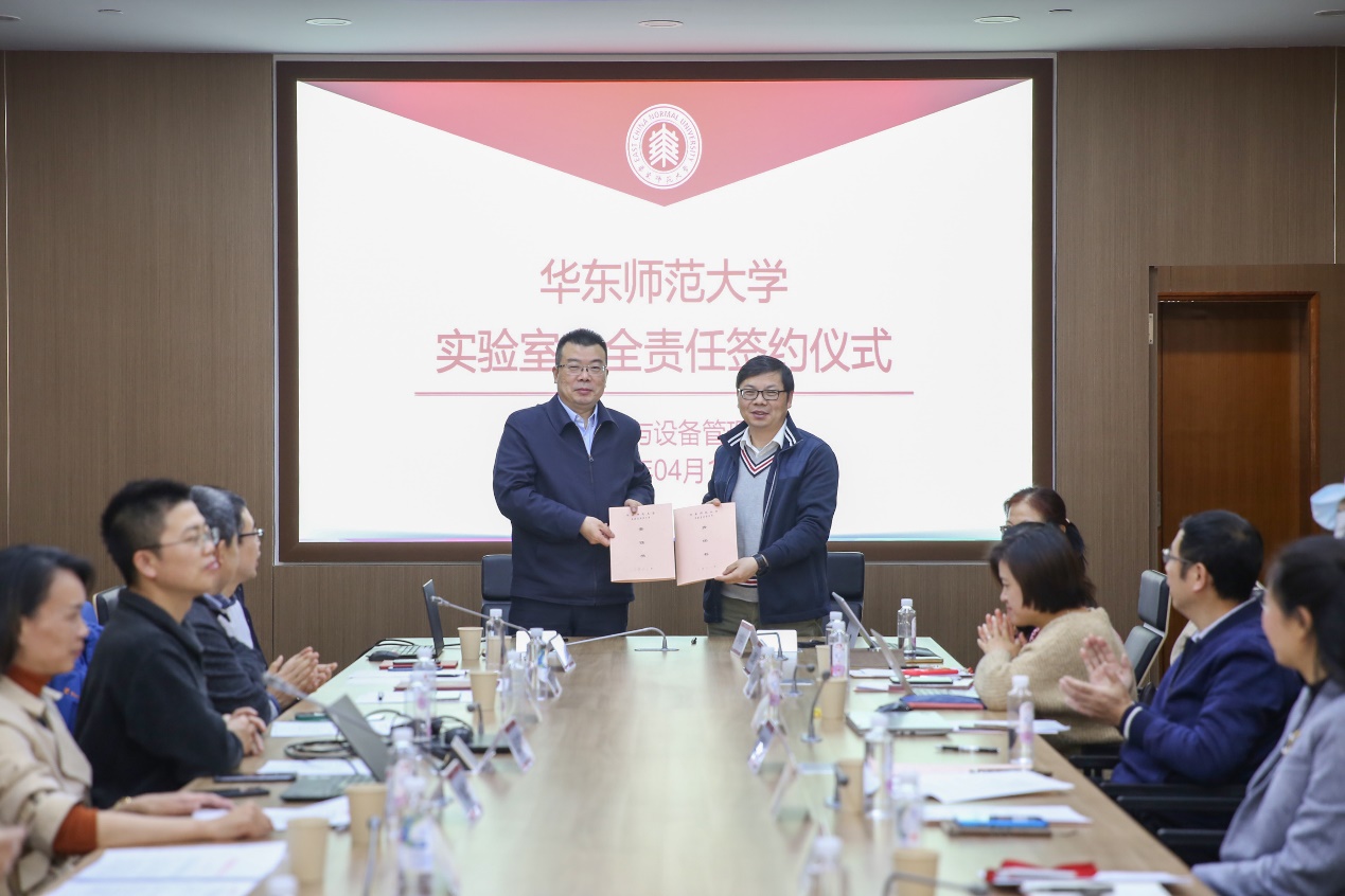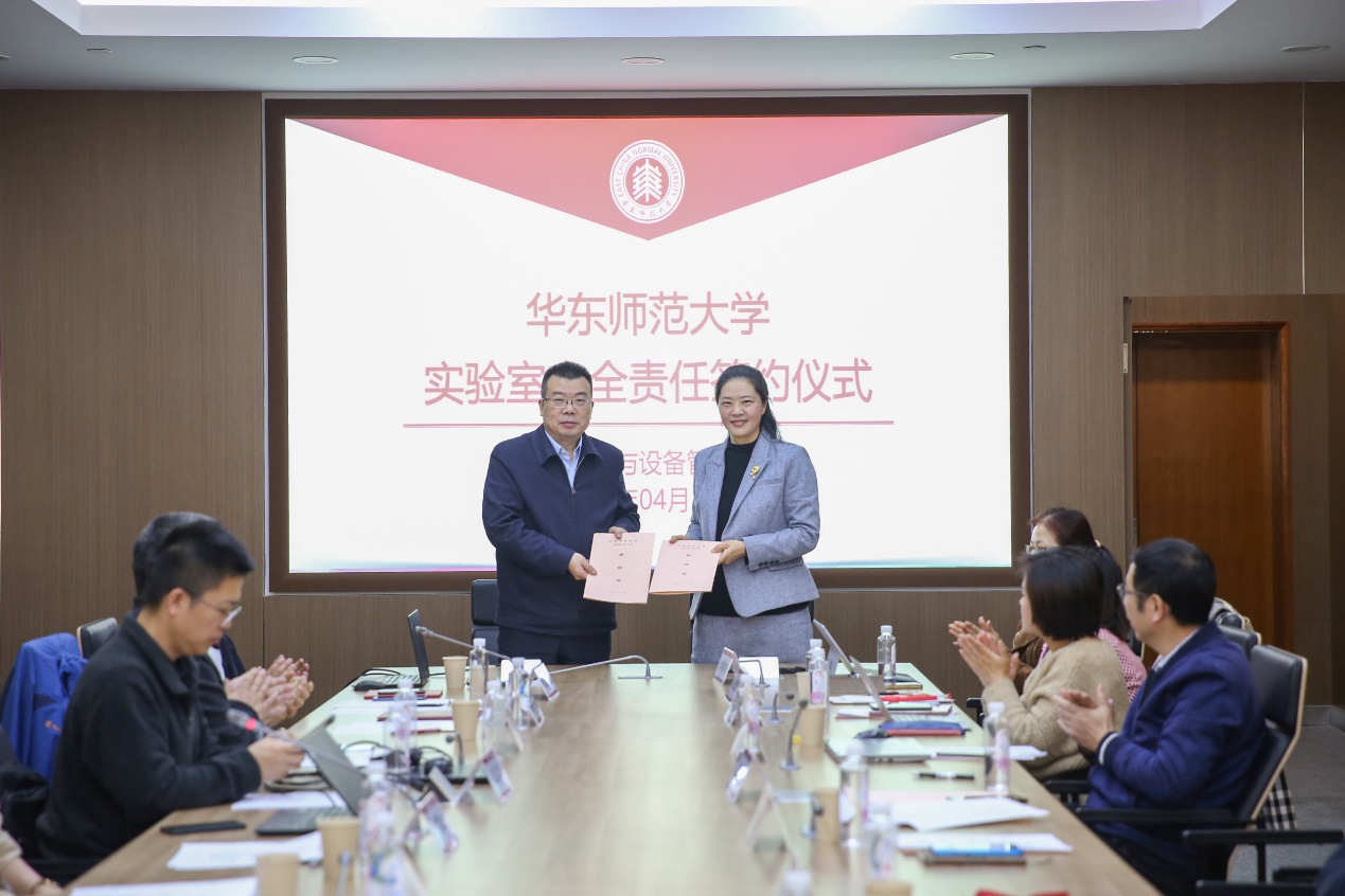为了进一步落实实验室安全责任,构建学校、二级单位、实验室三级联动的实验室安全管理责任体系,孙真荣现场与学校二级单位实验室安全工作第一责任人代表生态与环境科学学院党委书记刘婕、化学与分子工程学院党委书记鲜跃仲签署了2021年实验室安全工作责任书。黄岚兰分别从采购与条件保障、资产管理、实验室建设与安全管理、大型仪器共享管理、公共平台建设与管理等方面,对2021年实设处重点工作进行了部署。