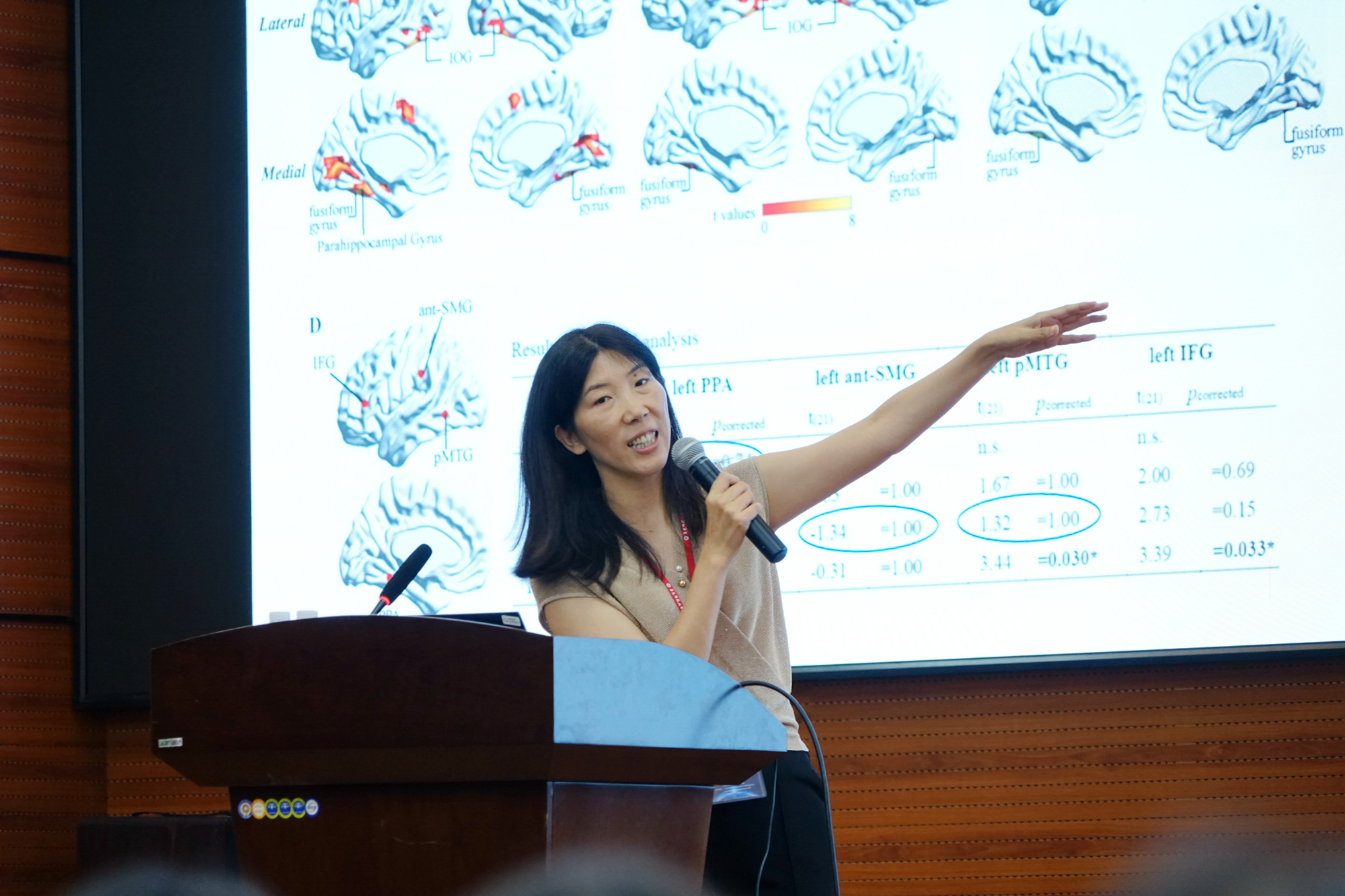 北京师范大学心理学部教授韩在柱介绍了视觉字形区域的形成原因及其在文字加工中所起到的具体作用,在“视觉形状假说”和“交互作用假说”的争议中为后者提供了重要的实验证据。中国人民大学心理系教授张清芳在报告中提出,书写运动会影响文字的字形识别过程。上海纽约大学助理教授田兴关注了言语产生这一完成语言交流的重要环节,分享了在不同人群上进行的一系列研究,对运动感知转换在言语产生中的机制进行了深入的探讨。上海外国语大学语言研究院教授蒋晓鸣则讨论了人类嗓音信息在语言交际中发挥的重要作用。
