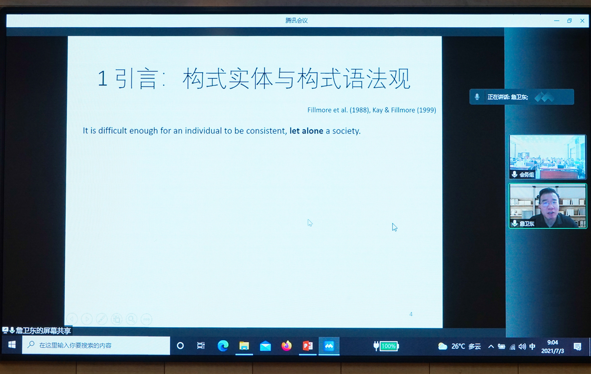 通过线上方式,北京大学中文系教授詹卫东介绍了北京大学中国语言学研究中心近年来开展的构式知识库建设和构式语料标注的语言知识工程实践。詹卫东提到,构式知识等语言数据资源应跟已有的知识资源整合,才能更有效地提供语言知识服务。