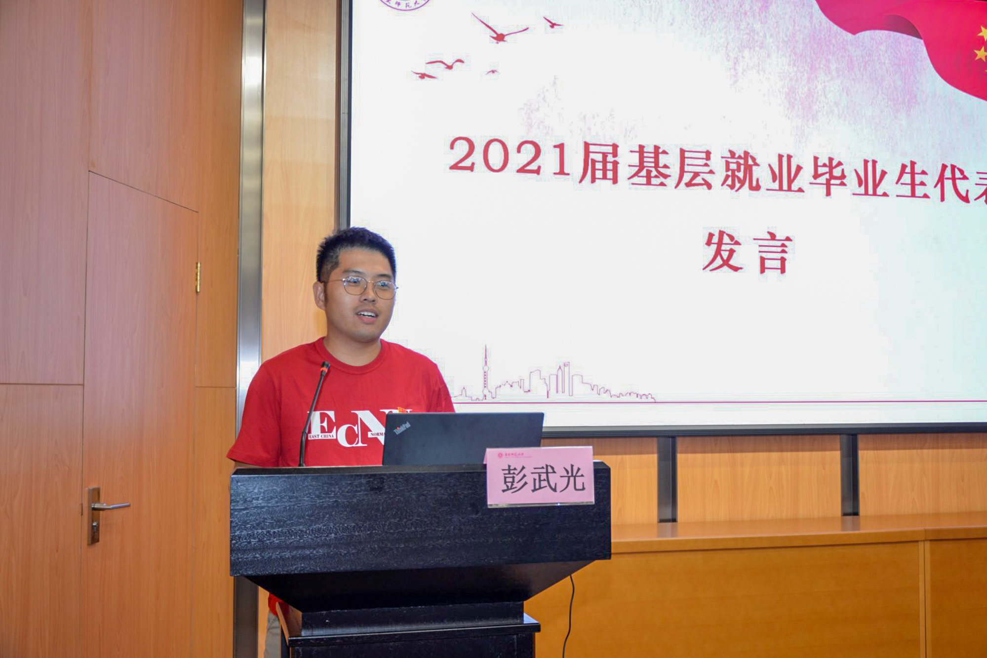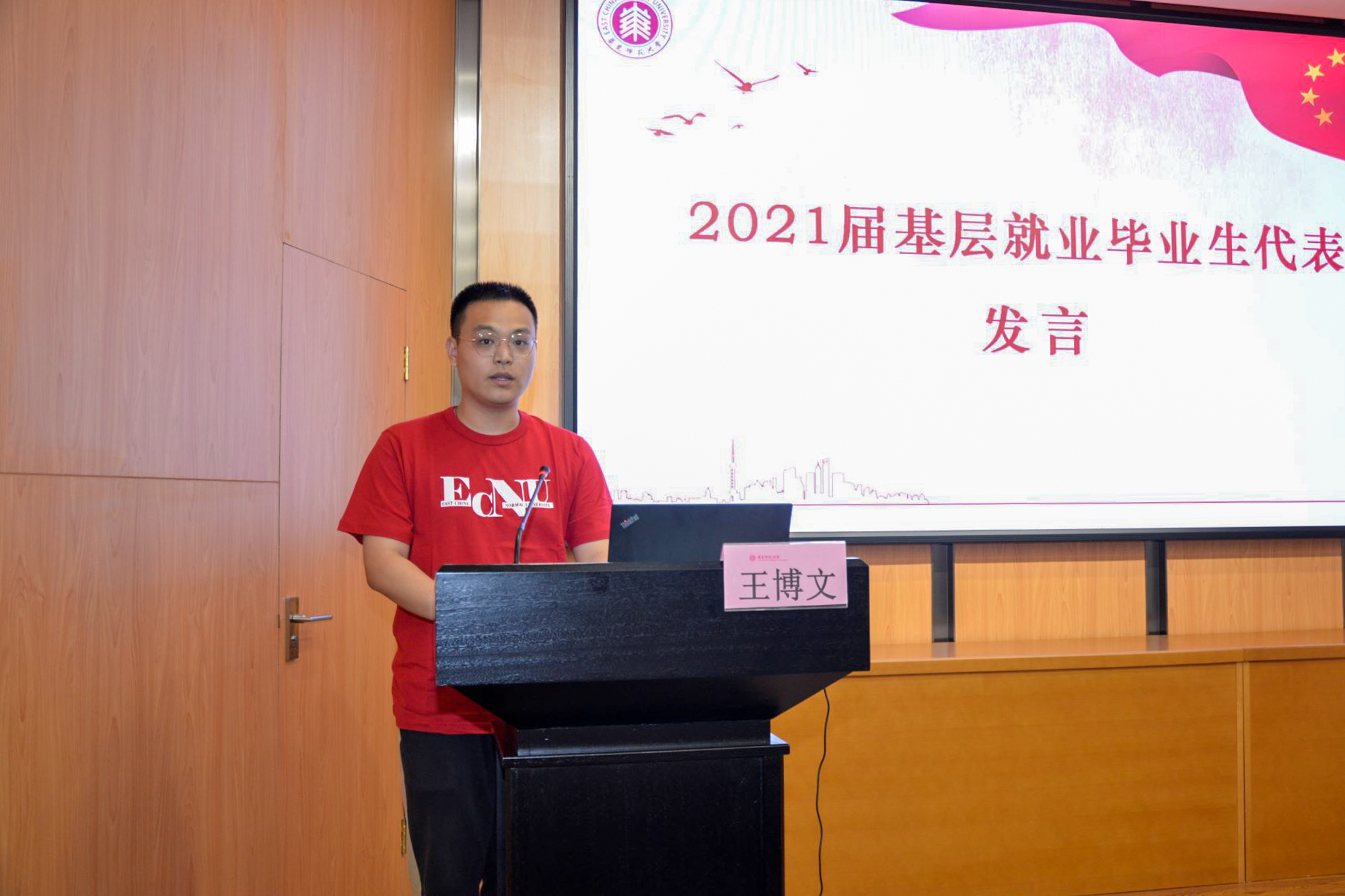 在交流环节,来自教育学部、传播学院、经管学部和化分学院的四位获奖毕业生代表作分享发言。来自学前教育专业的王怡婷同学,她表达了自己在疫情期间看到党和政府为了人民的生命健康与安全所做的努力,看到人民公仆在脱贫攻坚战中的种种事迹,深受鼓舞,为成为一名光荣的选调生,能够为人民服务而十分荣耀;王怡婷同时也表达了对学校的感恩眷恋和建功报国的坚定决心。出版学专业的崔梦莹,首先表达了对学校和学院的感谢,讲述了自己在求职路上追梦、逐梦、圆梦的过程,并为学弟学妹提供了有益的选调生备考建议,鼓励学弟学妹们从知识、技能和心理素质方面全面提升自己。工商管理专业的彭武光讲述了自己从小接受帮扶人员救助,长大后立志成为选调生,回到家乡做脱贫攻坚工作的心路历程;他对学校和老师们表达了感恩,分享了对“不忘初心、担当使命”内涵的深刻理解,并引用了习近平总书记的“当官就不要发财,发财就不要当官”关于廉洁自律的重要论述,与在座毕业学子共勉。最后,来自化分学院物理化学专业的王博文,讲述了在疫情期间看到基层工作人员辛勤工作、舍身奉献的事迹时的深深触动,观看影视作品《山海情》时对片中西海固人民和干部们响应国家扶贫政策,通过辛勤劳动和不懈探索,将风沙走石的“干沙滩”建设成寸土寸金的“金沙滩”的故事而产生的无比自豪,这些都促使自己最后毅然选择成为一名选调生,到基层实现自己的人生理想,为祖国建设贡献自己的青春热血。