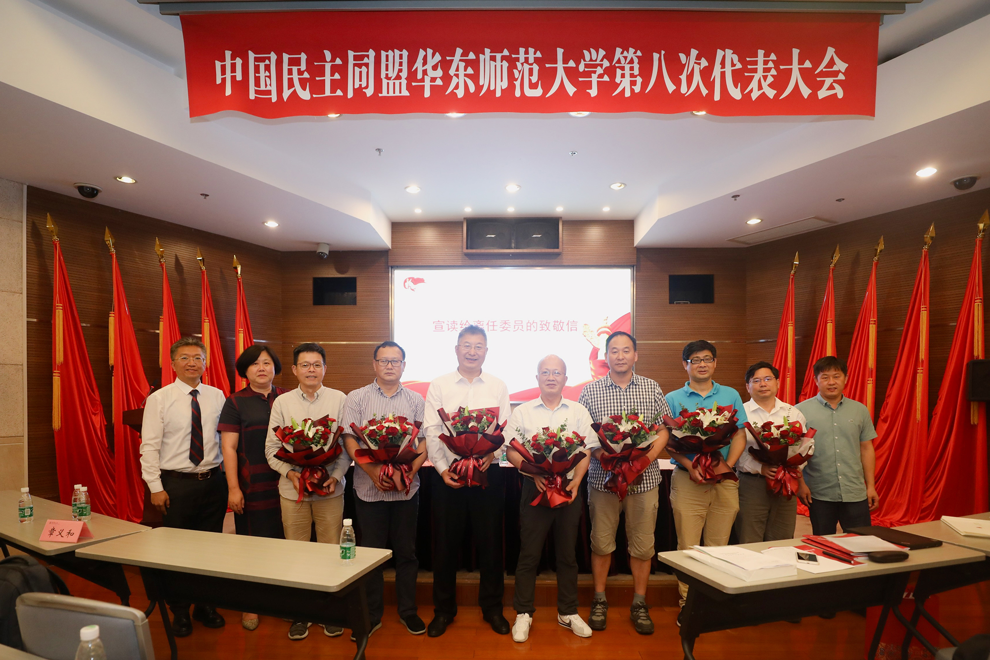 大会向章义和、由文辉、陈毅华、唐思贤、侯经川、吕长虹、吴永和、徐连明、黄新力、甄德文等十名离任委员宣读了致敬信并献花,感谢他们多年来为民盟华东师大事业作出的贡献。