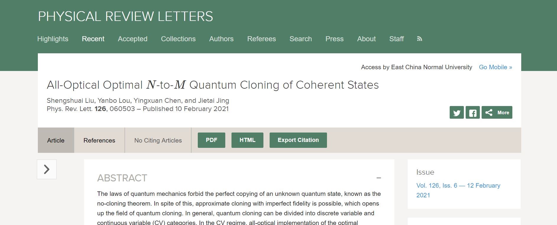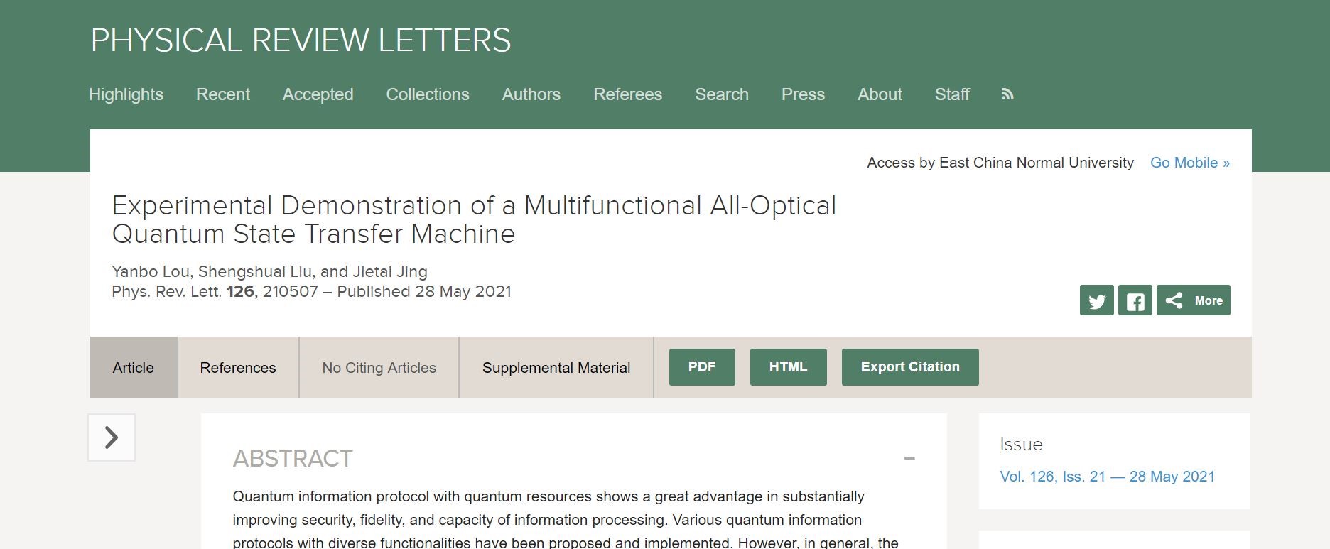 近期,永利皇宫登录官网精密光谱科学与技术国家重点实验室荆杰泰教授团队在量子信息领域连续取得重要进展,两项相关研究成果相继发表于国际物理学重要学术期刊《物理评论快报》(Physical Review Letters 126, 060503 (2021) 以及Physical Review Letters 126, 210507 (2021))。量子信息协议利用量子资源突破经典信息处理方式,从而实现高容量、高保真度以及高安全性的新型信息处理。荆杰泰教授团队长期致力于发展新型量子光源及其在量子信息科学中的应用研究。该团队近期连续取得的两项科研成果聚焦于提升量子信息协议的信息处理保真度,分别在实验上实现了全光学最优化N→M量子克隆和多功能全光量子态传输机,研究了这两种量子信息协议中信息处理保真度提升的机制。