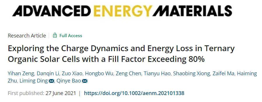 近日,永利皇宫登录官网物理与电子科学学院保秦烨教授课题组在软半导体界面物性与光电调控领域连续取得进展,两项成果分别以“Exploring the charge dynamics and energy loss in ternary organic solar cells with a fill factor exceeding 80%”和“Additive-induced synergies of defect passivation and energetic modification toward highly efficient perovskite solar cells”为题发表在国际学术期刊Advanced Energy Materials(影响因子:29)上,硕士生曾逸涵和博士生熊少兵分别为两篇论文的第一作者。