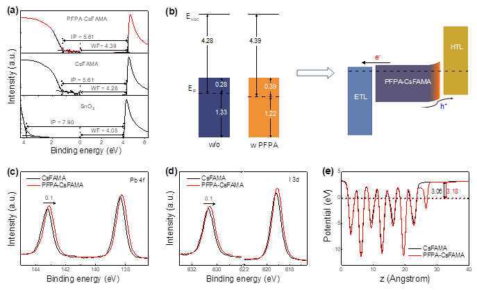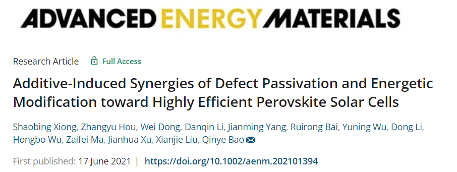 界面问题同样制约着钙钛矿光电器件效率向更高层次的发展。目前,主要使用添加剂钝化钙钛矿半导体表面缺陷的方法,促进电荷传输,但是其功能单一且效果有限。保秦烨课题组通过对添加剂与钙钛矿之间电荷转移机制的系统研究,利用光电子能谱超高真空互联系统,发现了添加剂改变钙钛矿半导体表面电子结构的现象,并且实验证实转变了的电子结构与顶部电子传输层界面更加匹配,进一步抑制了界面电荷非辐射复合能量损失,从而构建了一种添加剂同时钝化缺陷、改变电子结构的协同界面调控电荷输运的策略,为进一步提高钙钛矿太阳能电池的性能提供了新的方向(Adv. Energy Mater. DOI: 10.1002/aenm.202101394)。