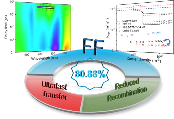 最近,保秦烨课题组通过构建PM6:DRTB-T-C4:Y6三元有机半导体异质结,取得了填充因子FF高达80.88%(第三方权威验证78.30%)的三元有机光伏器件。研究人员借助飞秒瞬态吸收光谱、瞬态光电压/光电流等手段,并结合电荷提取-复合竞争模型,深入分析了其界面载流子动力学与能量损失。研究发现,即使在不同光强条件下,与二元PM6:Y6体系相比,PM6:DRTB-T-C4:Y6展示了高激子扩散和解离速率,长载流子寿命,以及较低的非辐射复合系数。同时电路模型进一步证实界面能量损失接近于最优状态。该工作揭示了取得高填充因子的物理机制(Adv. Energy Mater. DOI: 10.1002/aenm.202101338)。