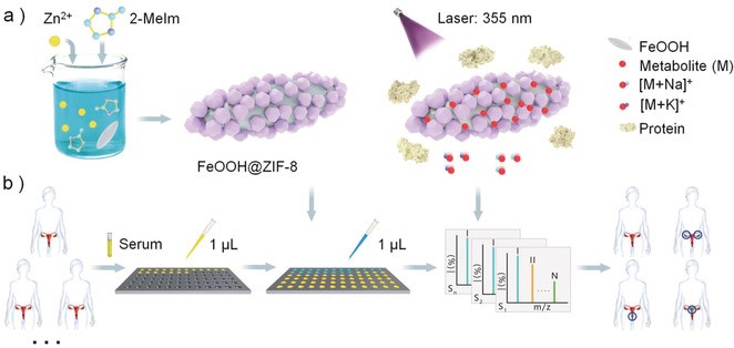 图3.FeOOH@ZIF-8复合材料的制备及其在疾病检测中的应用
