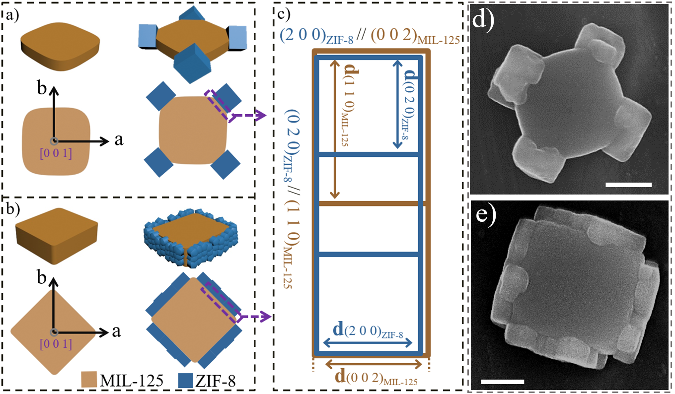 鉴于此,研究团队以Ti基MOF、MIL-125为主体材料,沸石咪唑框架材料ZIF为客体MOF,创新性地提出一种多重选择性组装机制,首次实现了三元MOF位点的选择性组装(图1、2)。通过选择结构对称性较低的蛋糕状MIL-125为主体MOF,利用不同暴露晶面、表面电荷以及官能团诱导不同客体MOF在主体MOF不同晶面的选择性生长;同时,有效调控各生长步骤对MOF的相互作用方式(如外延生长、静电吸引以及配位作用),成功实现不同组成客体MOF空间分布的高度控制。基于此,制备了系列二元和三元MOF异质组装材料,为MOF复合材料的可控合成提供了新思路(Chem. Sci., 2020,11, 3680; Nature Communications, 2020, DOI : 10.1038/s41467-020-18776-z)。