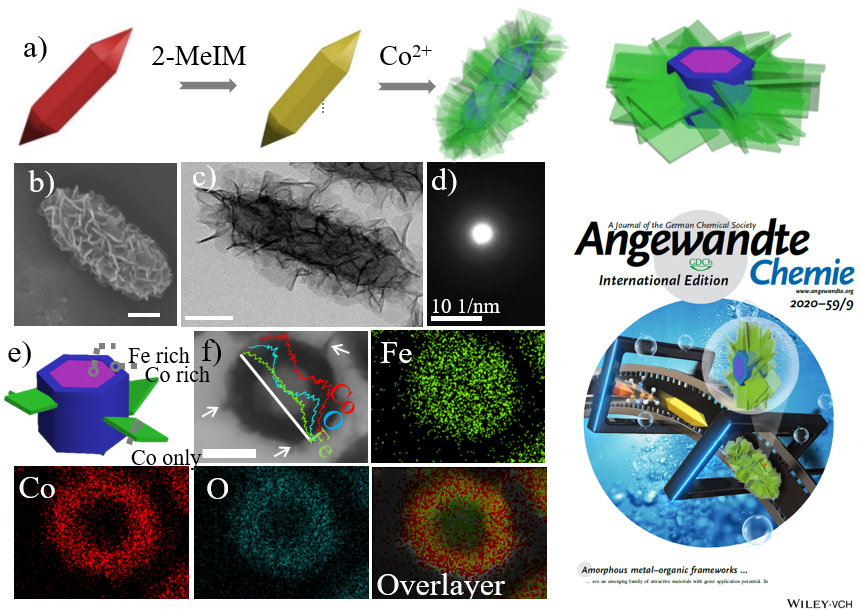 除了对纳米结构及组成分布的控制,研究团队还进一步实现对MOF组装材料结晶程度、纳米结构及组成的同步调控。首次提出配体竞争诱导非晶化策略,实现原本热力学上无法进行的MOF配体替换,并将反应条件从高温、长时间、高pH优化至室温、短时间和几乎中性。相对温和的条件为非晶化MOF结构组成调控提供更大空间,也为非晶化MOF材料合成提供新途径(图5)。基于此方法,团队成功制备具有核壳纳米棒-纳米片等级结构的Fe-Co双金属非晶态MOF材料,并且各个单元的组分均不相同,相关材料在电催化领域展示了潜在的应用前景(Angew. Chem. Int. Ed. 2020, 59, 3630)。