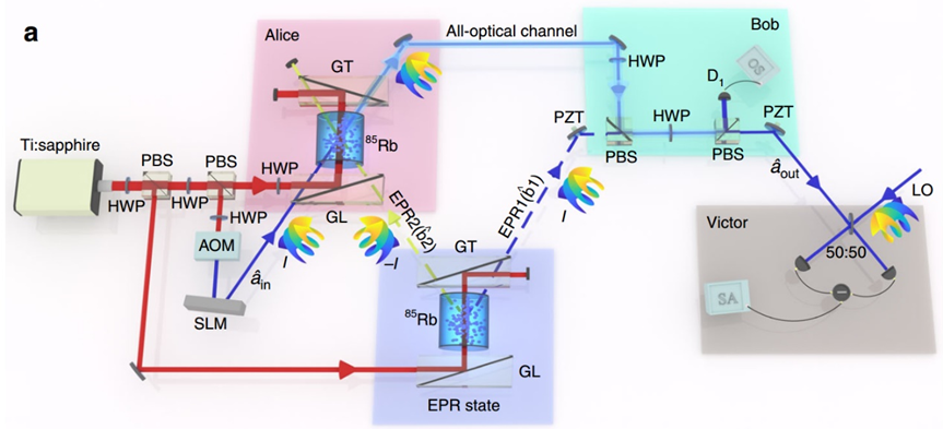 在实验中,该团队首先利用原子系综四波混频过程制备了多通道光学轨道角动量复用的连续变量纠缠源,并分发到参与量子隐形传态协议的发送方(Alice)以及接收方(Bob)。Alice利用一个高增益光学参量放大器,把待传输态与她所拥有的量子纠缠资源进行模式匹配的参量放大,并将放大后的光学输出无测量地通过一个全光通道传输给Bob。Bob在收到全光信号之后,利用一个线性光学分束器,将其与自身所拥有的量子资源进行相干操控,从而实现待传态的高保真复现。通过利用光学轨道角动量模式对待传态进行编码,实现了九通道量子隐形传态保真度对经典极限的突破,演示了单一体系中九个量子隐形传态通道的同时构建。