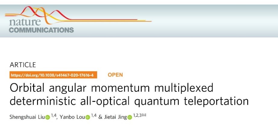 永利皇宫登录官网精密光谱科学与技术国家重点实验室荆杰泰教授团队利用前期发展的光学轨道角动量复用的连续变量纠缠源结合全光量子隐形传态协议,在国际上首次实验成功构建了多通道复用的全光量子隐形传态协议,为发展高容量连续变量量子信息协议奠定了重要的科学基础。该成果以“Orbital angular momentum multiplexed deterministic all-optical quantum teleportation”为题于2020年8月发表在Nature Communications上。永利皇宫登录官网为论文的第一完成单位,精密光谱科学与技术国家重点实验室的博士研究生刘胜帅和娄彦博为论文的共同第一作者,荆杰泰教授为论文的通讯作者。