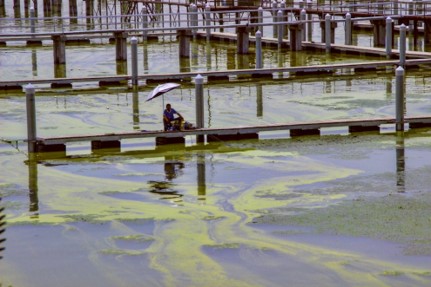 一位老人在蓝藻爆发时进行垂钓