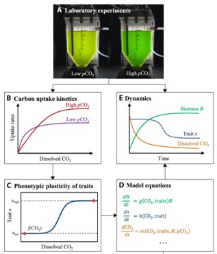 (A)单一铜绿微囊藻在定制的生物反应器内,以低CO2和高CO2的条件进行培养。(B)当藻细胞到达生长稳态后,其碳利用动力学指标被分别跟踪测量,(C)测量数据被纳入了数学模型中考量。(D)该模型可用来预测藻类的种群密度,吸收动力学和无机碳利用的动态变化。(E)模型预测结果可通过生物反应器的实验结果对比进行验证。最终,经过实验室数据验证的数学模型可用来推测在湖泊的尺度范围内,水华蓝藻的表型可塑性如何响应大气CO2的升高,从而对蓝藻的爆发尺度做出准确的预测。