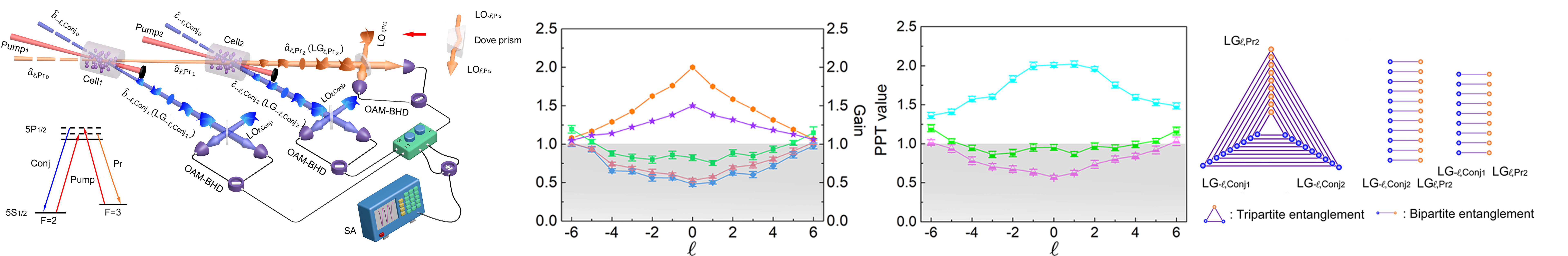 在实验中,该团队利用热原子系综中的级联四波混频过程产生了三光束的纠缠态。在这三束光通道中,系统同时确定性地产生了9组三光束纠缠的拉盖尔高斯(Laguerre-Gaussian,LG)模式和20组两光纠缠的LG模式。此外该工作还验证了系统中对三光束其中一束的拓扑荷数l进行符号变换后三束光不存在纠缠,从而证明了该级联四波混频过程中,非线性相互作用遵守光学轨道角动量守恒定律。该工作还研究了四波混频系统中三种不同类型的光学轨道角动量相干叠加模式情况下的三光束量子纠缠特性,多方面展示了系统丰富的纠缠结构。这项成果以“Deterministic Generation of Orbital-Angular-Momentum Multiplexed Tripartite Entanglement”为题,以永利皇宫登录官网精密光谱科学与技术国家重点实验室为第一完成单位,博士研究生李思瑾与潘晓州为论文共同第一作者,荆杰泰教授为论文通讯作者,于2020年2月28日发表在《物理评论快报》(Physical Review Letters 124, 083605 (2020))上。