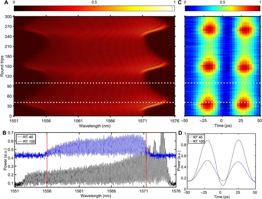 曾和平教授课题组首次确立了通用的、可靠的在激光器中激发呼吸子的方法。其中,非线性管理是激发呼吸子的关键。与传统飞秒激光器输出幅度一致的脉冲不同,呼吸子激光器输出的脉冲光谱,时域宽度和能量会周期性迅速改变。利用快速探测方法-色散傅里叶变换法,该团队实验上首次揭示了呼吸子的光谱和时域实时演化动力学特性。