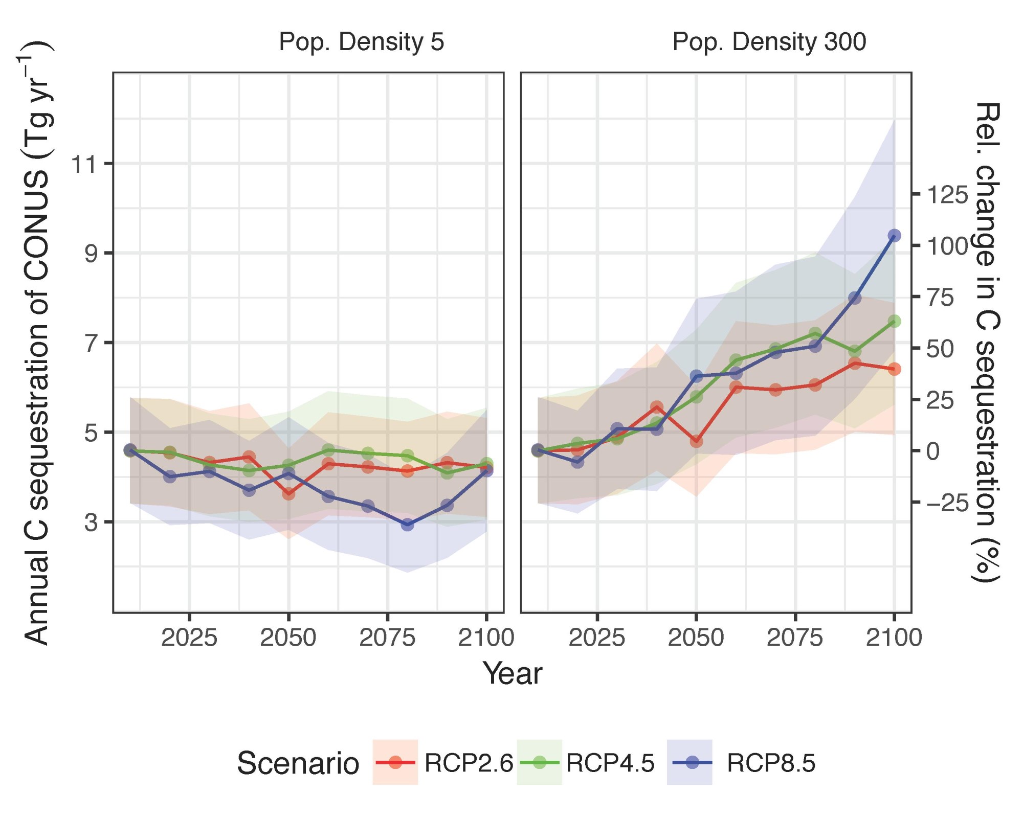 图2 未来三种不同气候变化情景下美国大陆滨海湿地年总固碳量的模型模拟结果