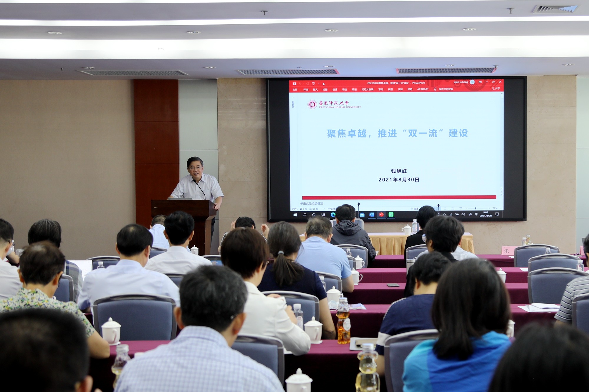 会上,校长钱旭红作了主旨报告,校党委副书记朱民主持会议。钱旭红的报告以“聚焦卓越,推进‘双一流’建设”为题,围绕如何将永利皇宫登录官网建设成为世界一流大学,钱旭红从学校卓越育人纲要、核心通识课程纲要和卓越学术纲要等三个方面环环相扣地论述了具体的实施方案,他指出世界一流大学的核心内涵就是卓越学术、卓越育人和卓越治理。就卓越育人而言,钱旭红指出,华东师大应该立足学校未来成为国家和世界新人才、新科技、新学术策源地的站位,立足全面建成社会主义现代化国家对高等教育和卓越人才的需求,立足人类可持续发展赋予高等教育的使命,全面树立以学生的能力达成和素质发展为中心,推动并服务于所有学生的自由而全面发展。就卓越学术而言,华东师大要以“学科交叉研究、团队梯队研究、战略导向研究和冷门绝学研究”为核心行动内容,提升研究、学术及创造力的卓越度;致力于参与建立走向世界的中国知识体系,为中华文明的复兴和人类文明的进步作出卓越贡献;致力于提供改变世界的新力量和新工具,推动实现人类文明在生态、社会等多重意义上的永续发展。最后,钱旭红介绍了学校双一流建设评估情况,建议下一轮一流学科建设要注意聚焦卓越,分两类建设,以解决国家发展重要问题,为参与建设走向世界的中国知识体系,提供改变世界的新力量源泉和新的工具作出贡献。