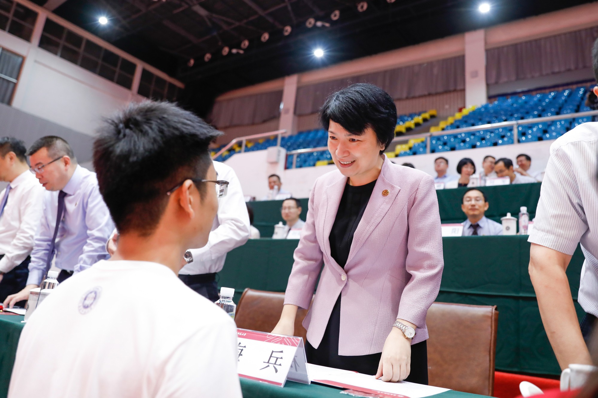 校党委书记梅兵为新生代表佩戴校徽