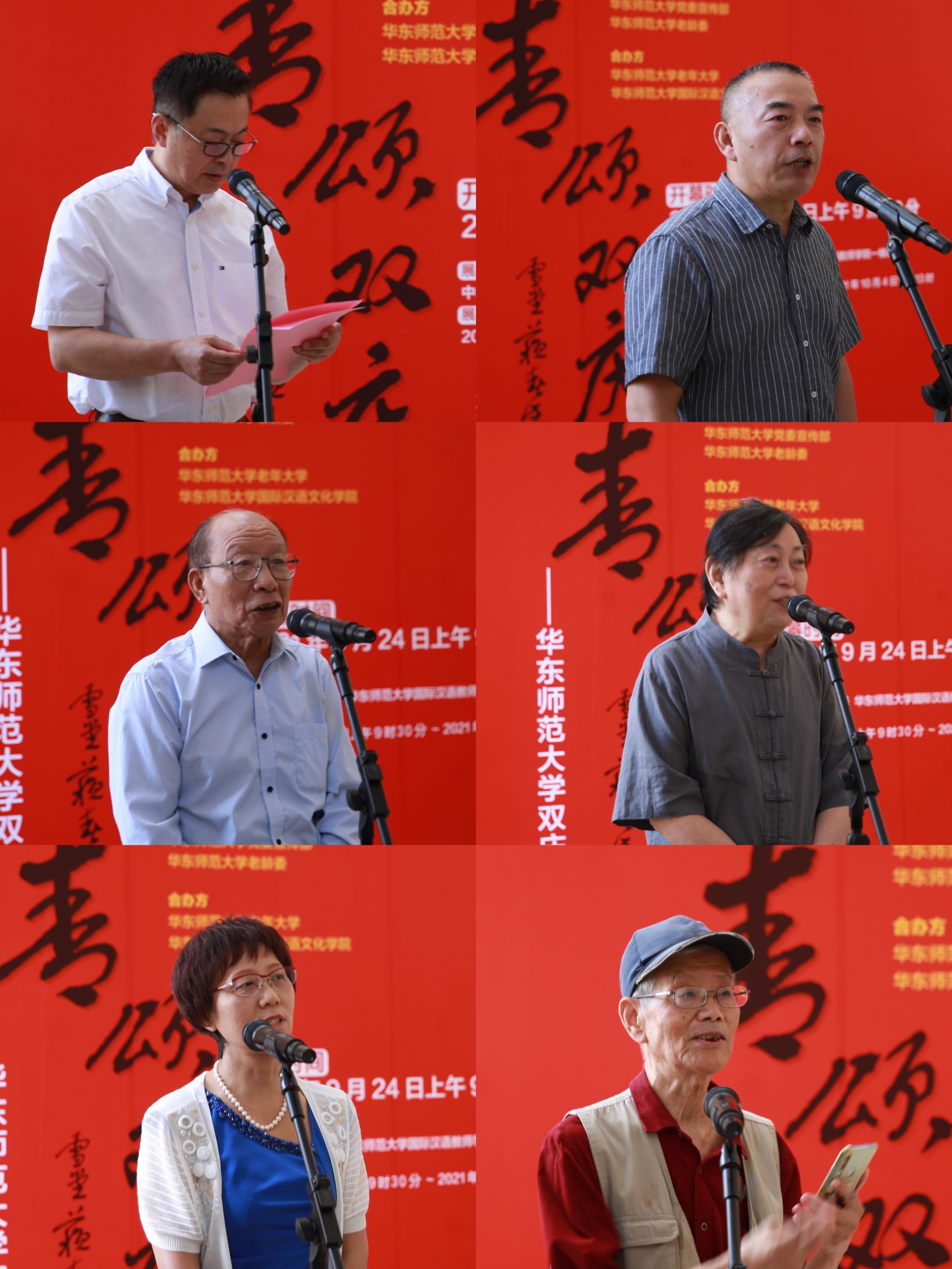 随后,上海市老干部岳阳楼书画社社长潘培坤代表外单位参展者在发言中表示,此次双庆书画展的意义和价值,远远超过了书画艺术作品本身,是一次以弘扬正能量为主题的书画作品展。画家苏春生表示,此次书画展用书画艺术庆祝建党一百周年与校庆七十周年非常有意义,并表达了希望在未来与各位书画爱好者一起提高、进步的美好期望。华东师大老年大学常务副校长裴建华在开幕式上回忆了与丽娃书画社多年来合作办展的经历并对积极参与此次活动的老年大学学员表示感谢。雕虫书画社社长许光华作为承办方代表,表示丽娃、雕虫书画社在今后将更好依托华东师大美术系和老年大学的优势,继续努力,再创辉煌。最后,党委宣传部副部长刘金玉宣布书画展正式开幕。与会人员随后移步展厅,欣赏和享受这一爱国爱校情怀与文艺作品交织辉映的精神文化盛宴。