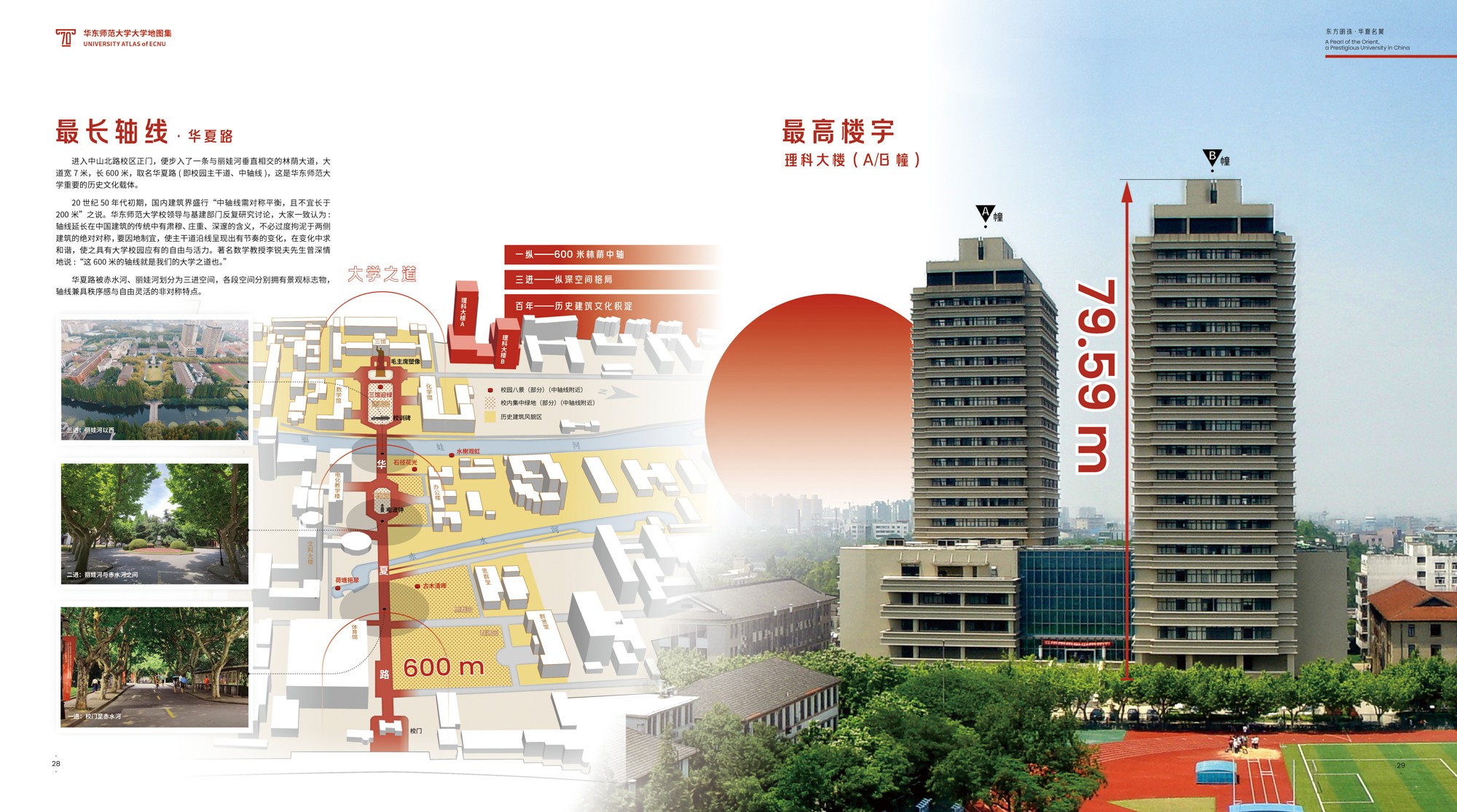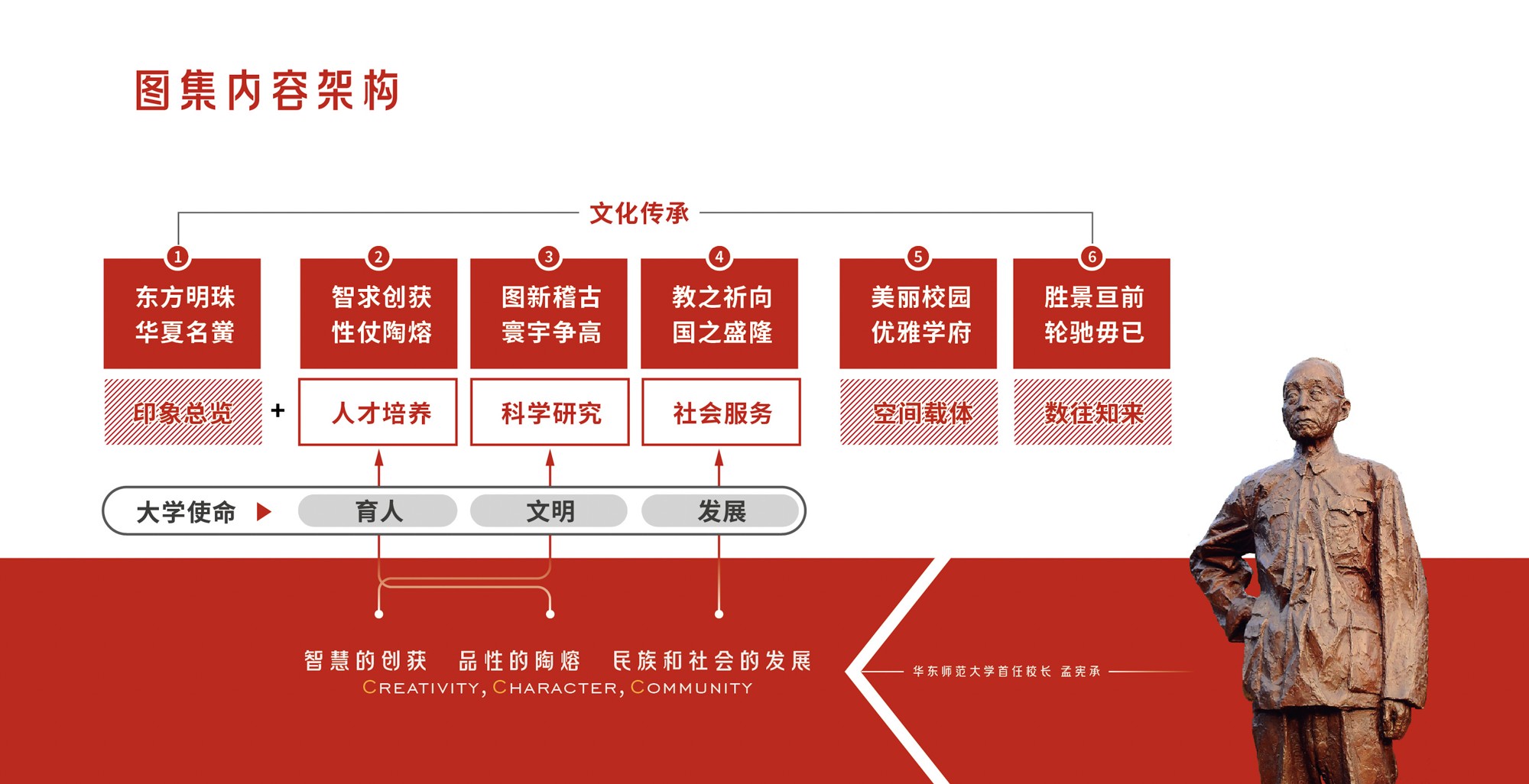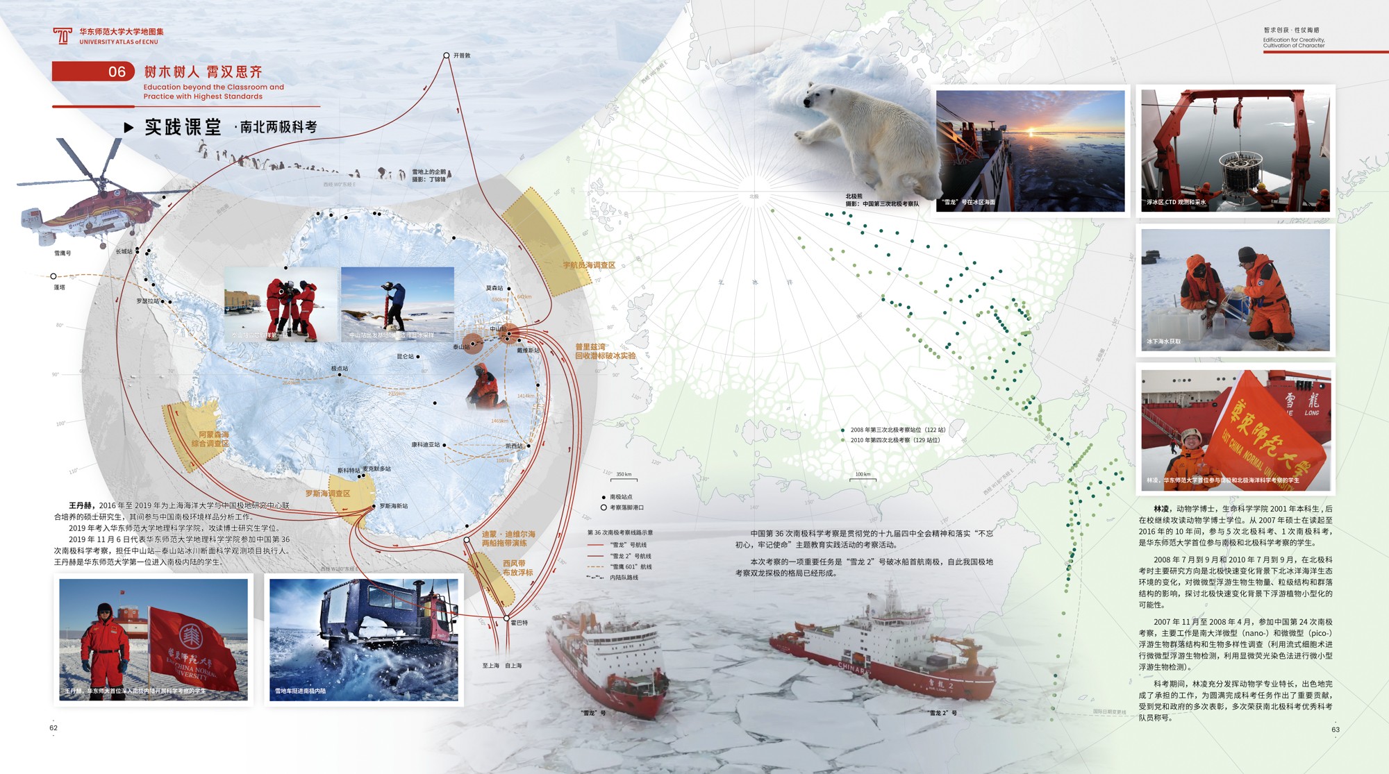 《地图集》围绕华东师大70年发展轨迹展开,共6篇19章,各篇章内容均有明确的主题,篇与章的命名主要取自华东师大 “大师石”《闵行校区勒石铭》 铭文。各篇篇名分别为“东方明珠·华夏名黉”“智求创获·性仗陶熔”“图新稽古·寰宇争高”“教之祈向·国之盛隆”“美丽校园·优雅学府”“胜景亘前·轮驰毋已”。内容主体部分为(第2-4篇),分别围绕大学“人才培养、科学研究、社会服务”等基本职能展开,第5篇承载传统校园物理空间,第1篇和第6篇前后呼应,从时间维度彰显文脉传承,6篇共同构成大学地图集叙事框架。