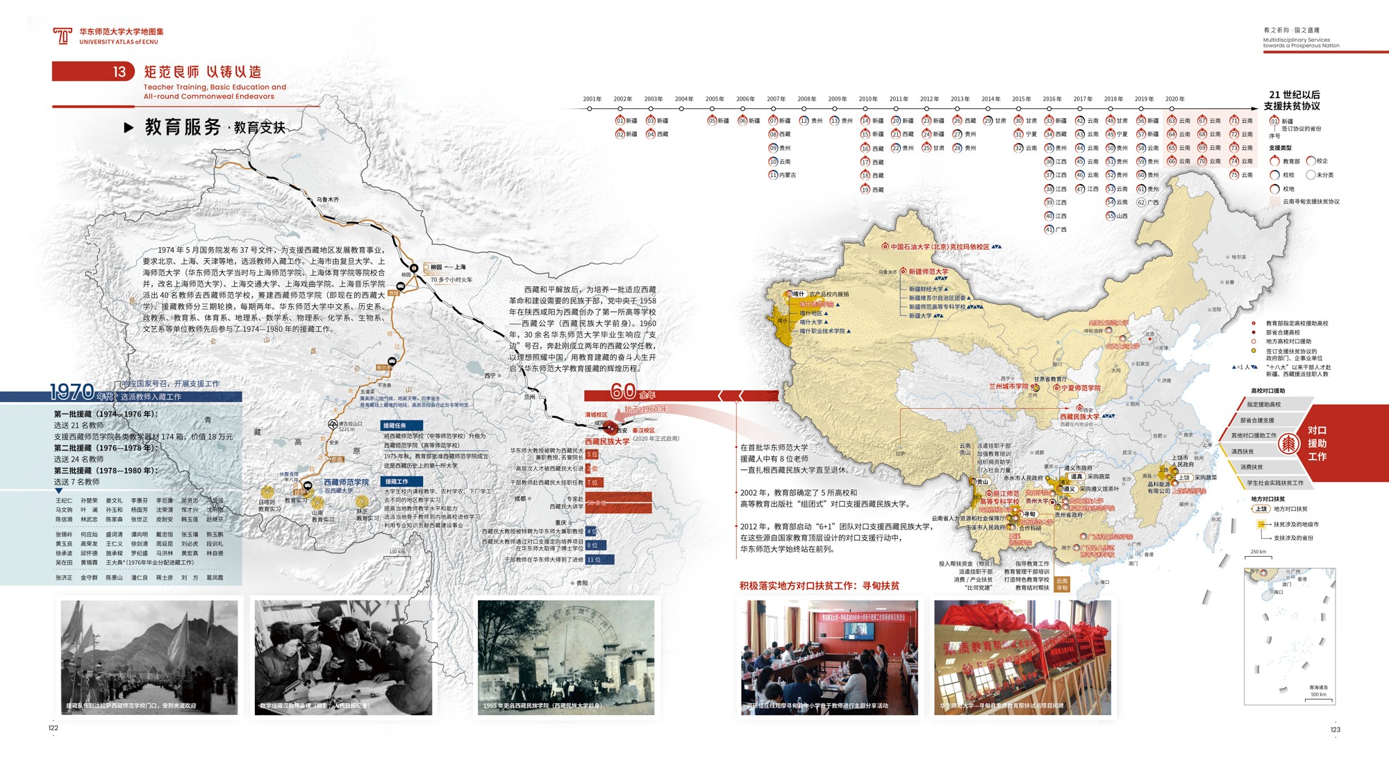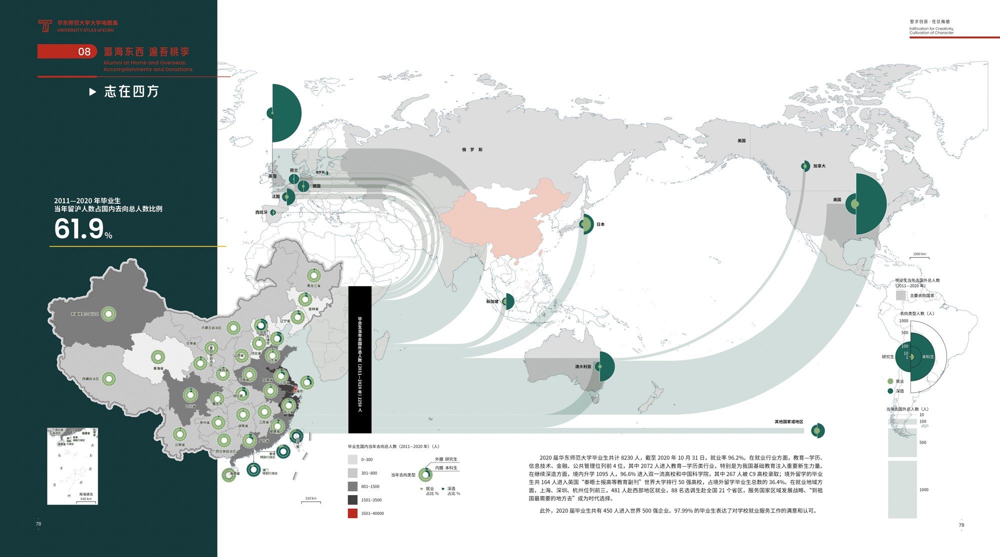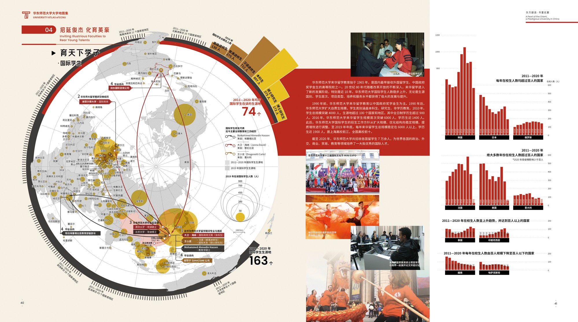 《地图集》围绕华东师大70年发展轨迹展开,共6篇19章,各篇章内容均有明确的主题,篇与章的命名主要取自华东师大 “大师石”《闵行校区勒石铭》 铭文。各篇篇名分别为“东方明珠·华夏名黉”“智求创获·性仗陶熔”“图新稽古·寰宇争高”“教之祈向·国之盛隆”“美丽校园·优雅学府”“胜景亘前·轮驰毋已”。内容主体部分为(第2-4篇),分别围绕大学“人才培养、科学研究、社会服务”等基本职能展开,第5篇承载传统校园物理空间,第1篇和第6篇前后呼应,从时间维度彰显文脉传承,6篇共同构成大学地图集叙事框架。