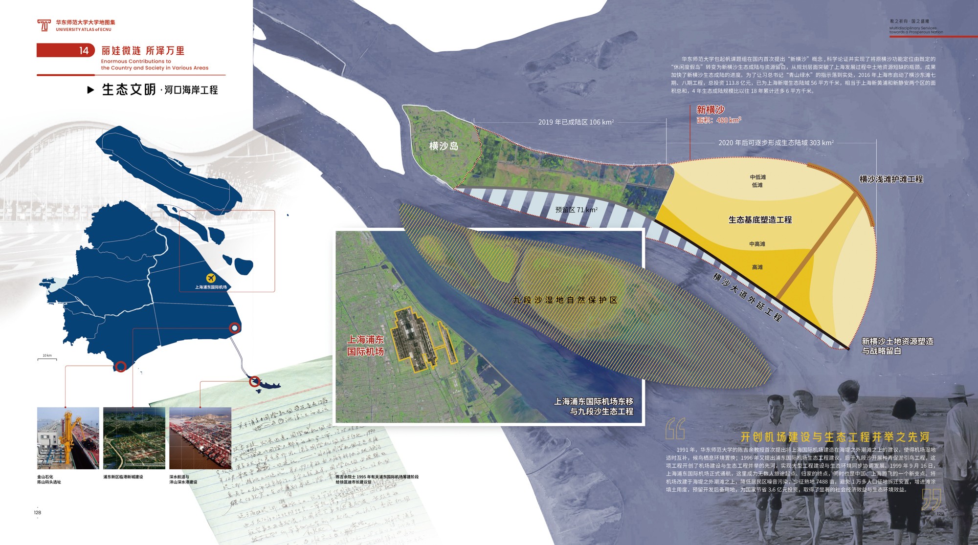 《地图集》主创之一、华东师大地图研究所唐曦副教授表示,这种“综合”表达系统,既是“空间的”,涉及全球、全国、上海和校园等各级地理尺度,又是“时间的”,跨越70载的历史回溯、当下呈现和远景展望;既是“素材的”,耦合地图、影像、统计图表、手绘图示、解说文字等不同表达形式,也是“视角的”,兼顾“横纵交叉”与“点面结合”,实现“上下贯通”与“内外联动”。