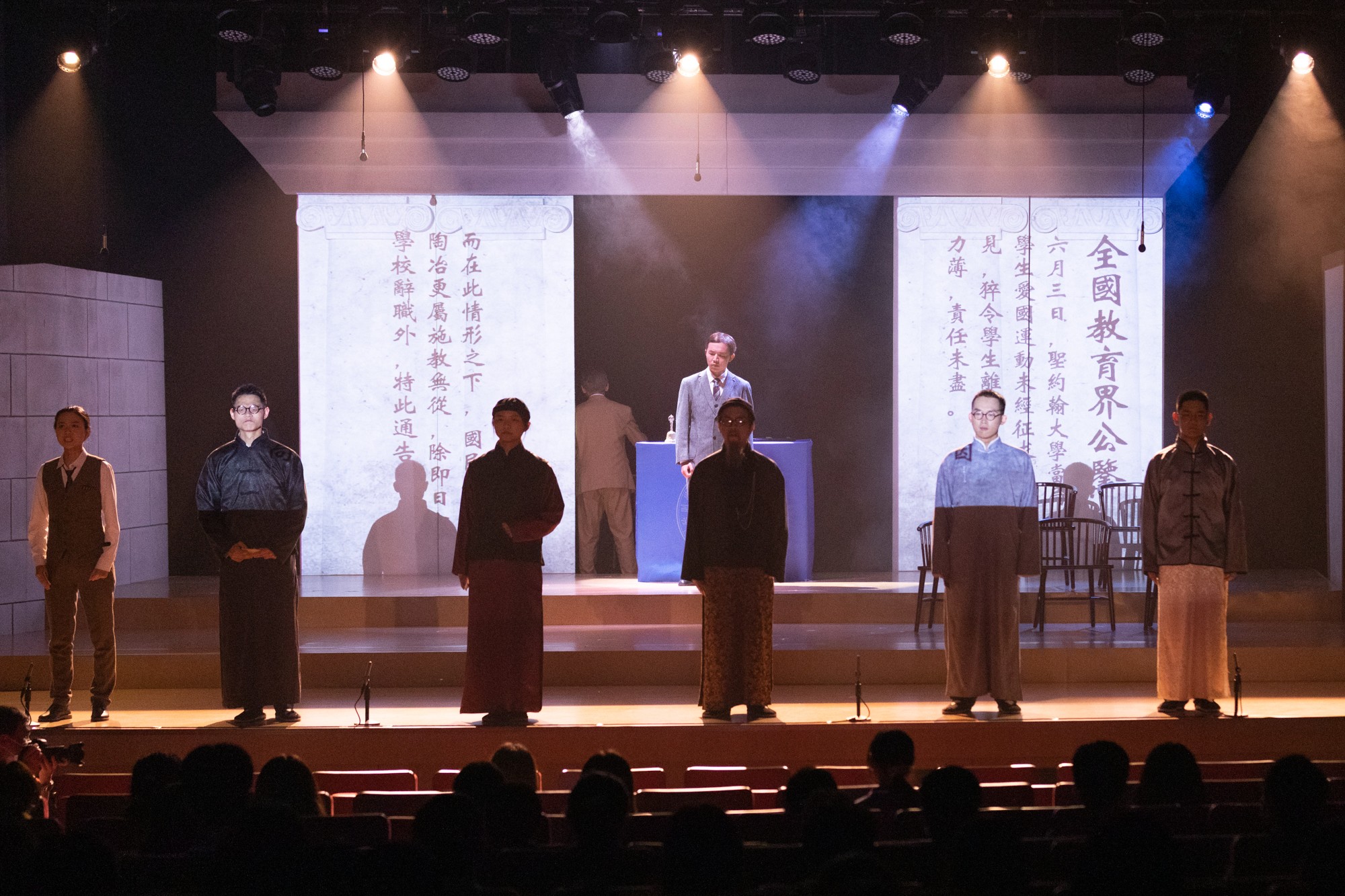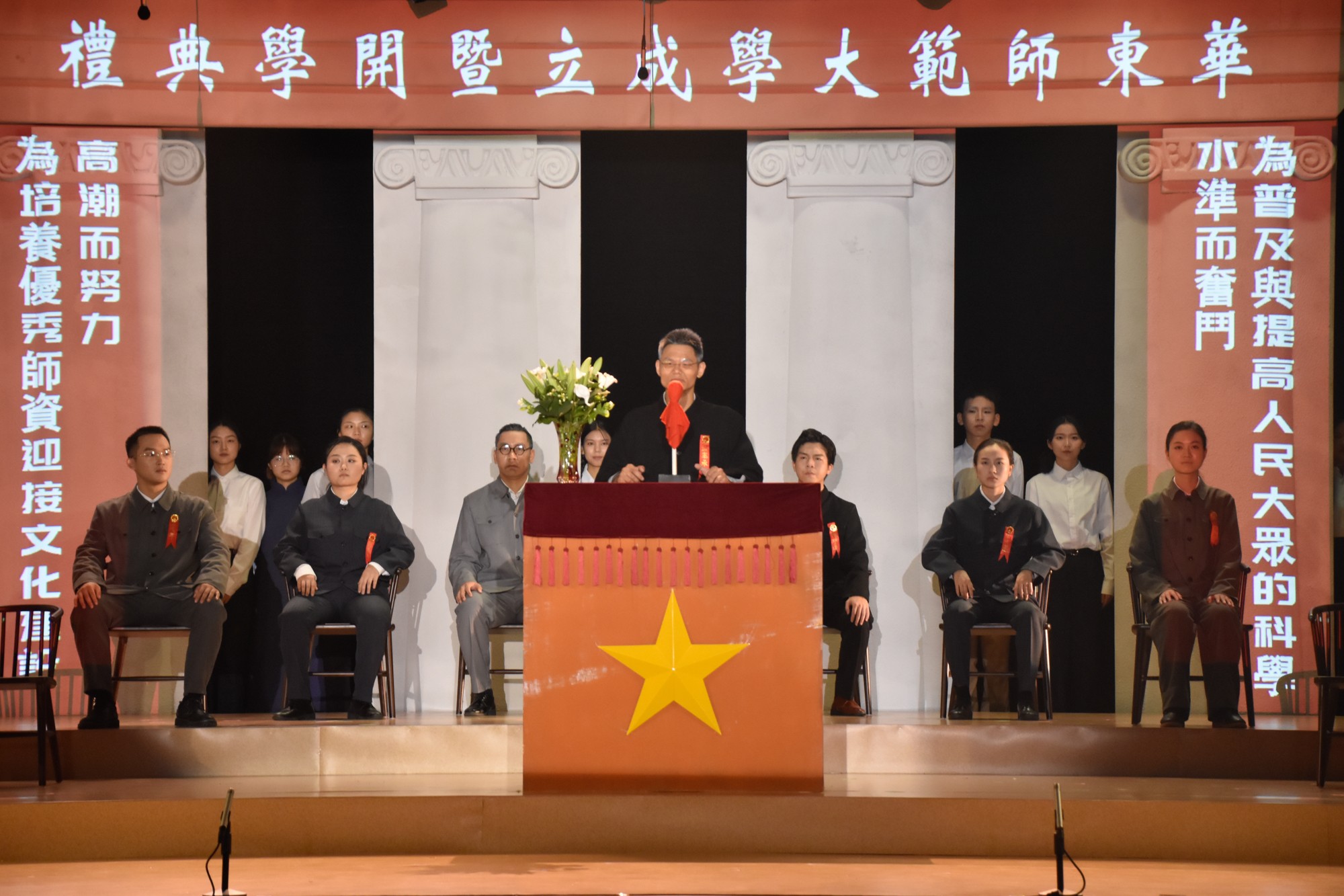 在大师剧演出的最后一幕,建校横幅挂起、各系师生点名落座……孟宪承先生宣布永利皇宫登录官网正式成立。此时此刻,师生校友们仿佛“穿越”到70年前,沉浸式感悟华东师大的使命以及华东师大人的责任,激发起将个人发展融入学校改革、民族和社会的发展的自觉和动力。